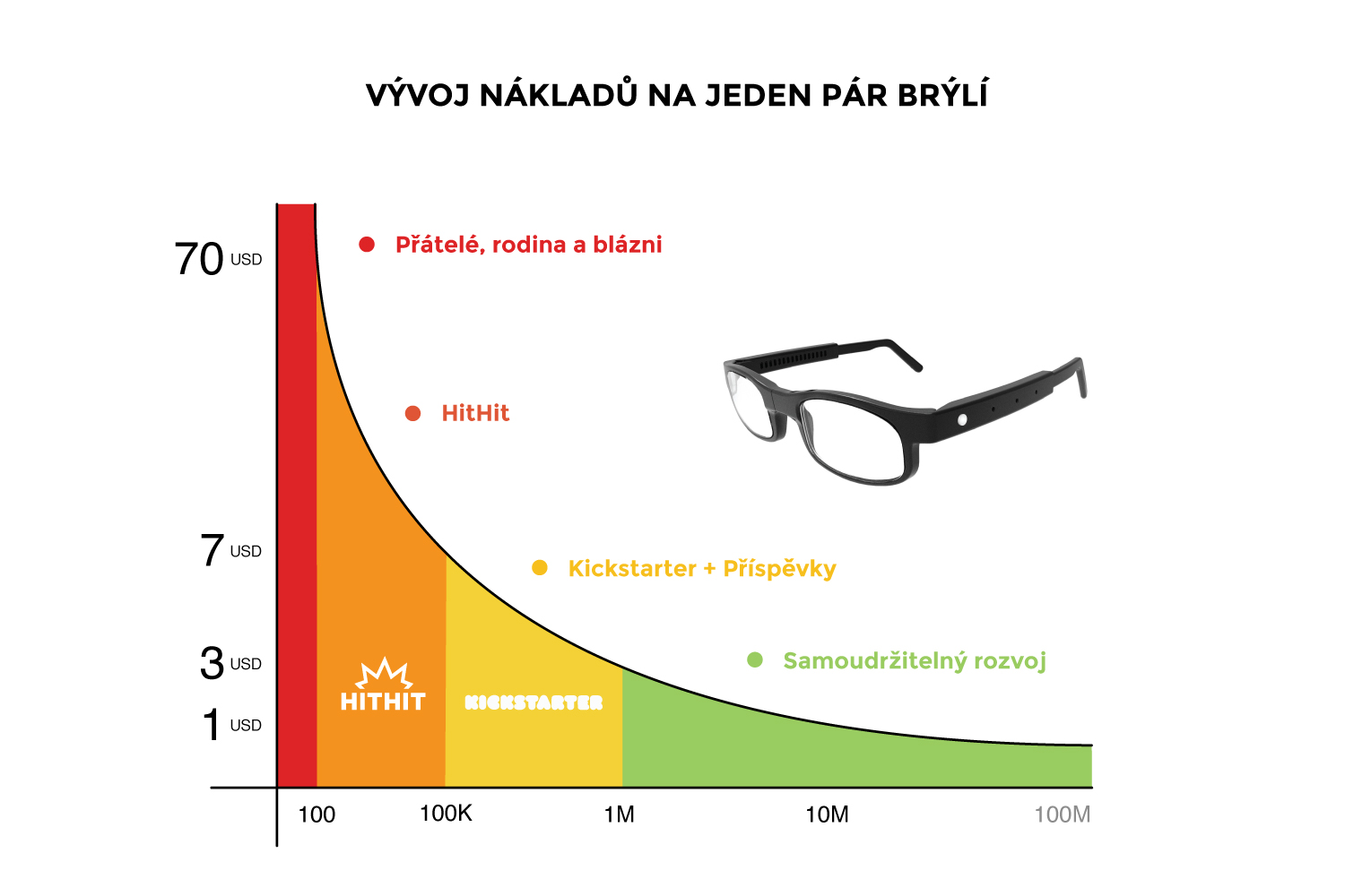 S pomocí Hithit kampaně se dostaneme na cenu 150 Kč za dodaný kus dioptrických brýlí při 100 000 vyrobených kusů. S cenou nám pomůže i tzv. “Matching Grant” od České rozvojové agentury zdvojnásobující vaše příspěvky. V nákladech jsou na začátku velké jednorázové položky jako je například "vstřikovací forma" pro lisování.