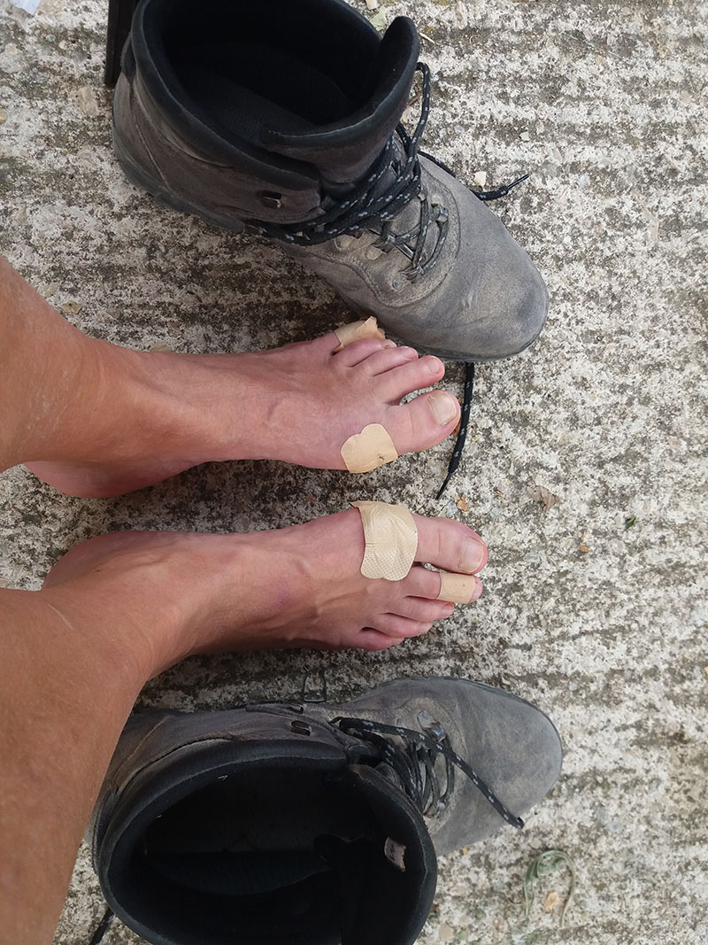 ... Svalila jsem se na výletní lavici a chvíli se různě natáčela, abych alespoň hlavu měla ve stínu. Rozvázala jsem levou botu. Už pěknou chvíli jsem měla pocit, že s tou nohou je něco jinak… Ponožka byla krvavá, sundala jsem ji. Z malíčku jsem odchlípla náplast nasáklou krví. Zhrozila jsem se. Bylo to děsivější, než jsem čekala, a to už jsem na ten pohled byla zvyklá. Obnažený prst se naplno řezavě rozbolel. Propadla jsem skutečné hrůze z toho, že camino nedojdu.