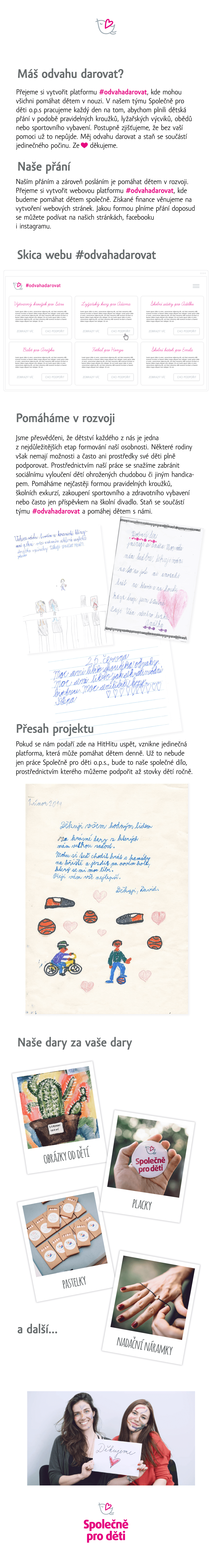 Chceme vytvořit webovou platformu #odvahadarovat, kde mohou lidé pomáhat dětem v nouzi. Budeme společně podporovat pravidelné kroužky, lyžařské výcviky, exkurze či školní obědy. Pomozte nám pomáhat. Ze ♥ děkujeme.