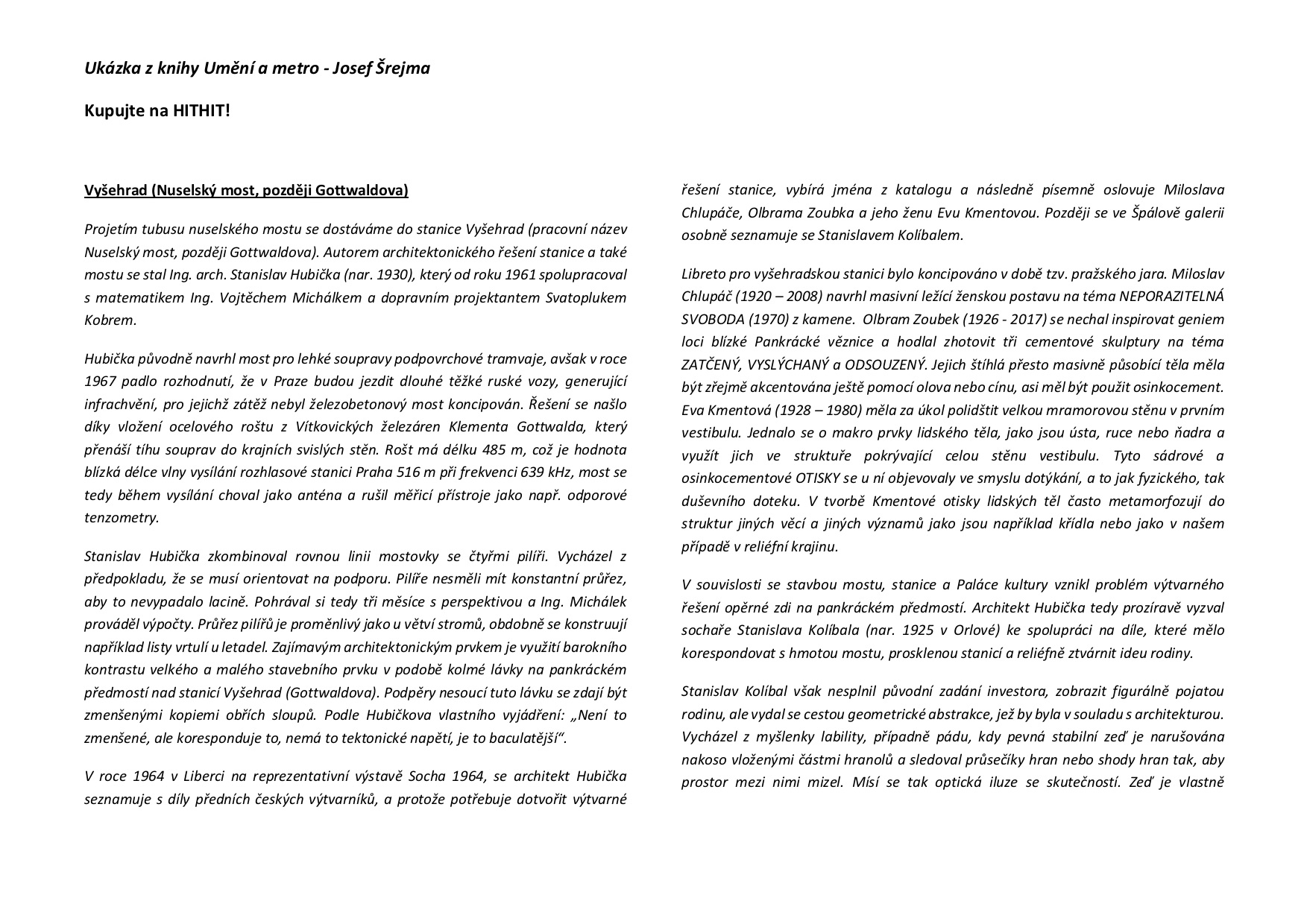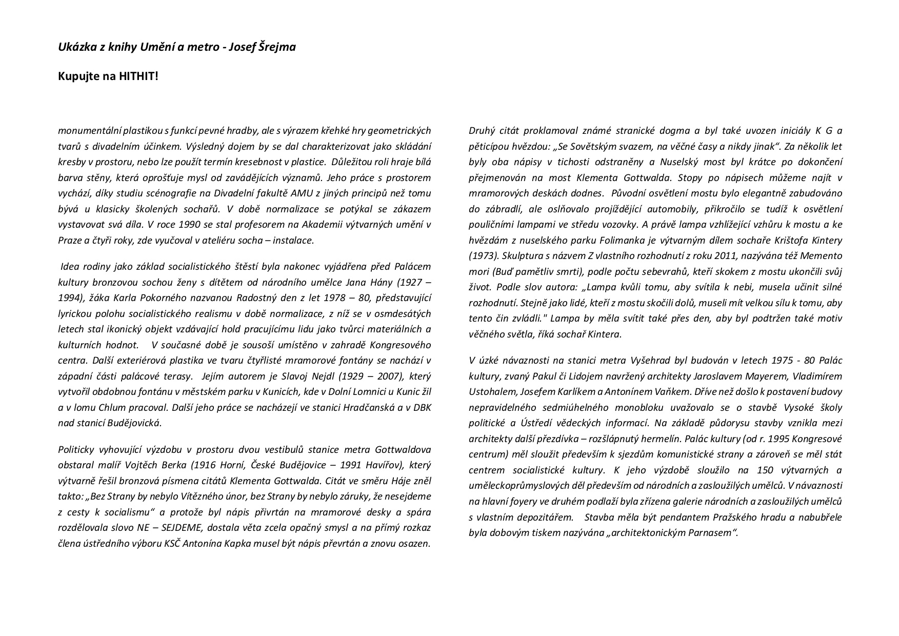 Potřebuji získat finanční prostředky k publikování knihy Umění v pražském metru, za pomoci crowdfundingové společnosti HITHIT. Kniha bude navazovat na můj projekt Umění v metru z roku 2014. 110 stran odborného kunsthistoricky zpracovaného textu s architektonickým popisem a ikonografickým rozborem všech stanic se všemi výtvarnými díly v rozmezí let 1974 až 1994, včetně výtvarné výzdoby přilehlých prostor metra, dále artefakty, které byly zničeny, zakryty nebo odstraněny. Základem knihy jsou původní významy a poslání výtvarného vybavení metra ve vztahu ke staniční architektuře. Přibližně 300 fotografií všech artefaktů s příslušným popisem názvů děl, techniky zpracování, datací a autorským určením. Je zde popsána problematika výtvarných soutěží a jejich účastníků. Text objasňuje původní názvy stanic, stručné životopisné údaje o umělcích a dobové reálie. Praha je asi jediná evropská metropole, která nemá svou vlastní výtvarnou monografii metra. Mgr. Josef Šrejma - historik umění