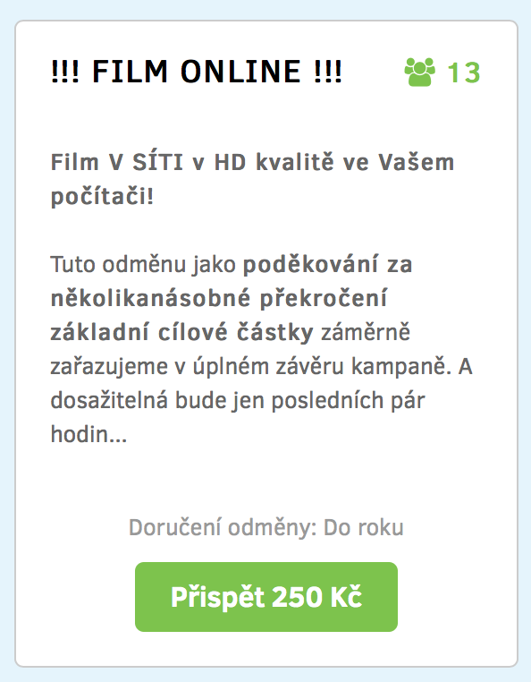 Doručení odměny: na poštovní adresu, do půl roku po ukončení projektu na Hithitu