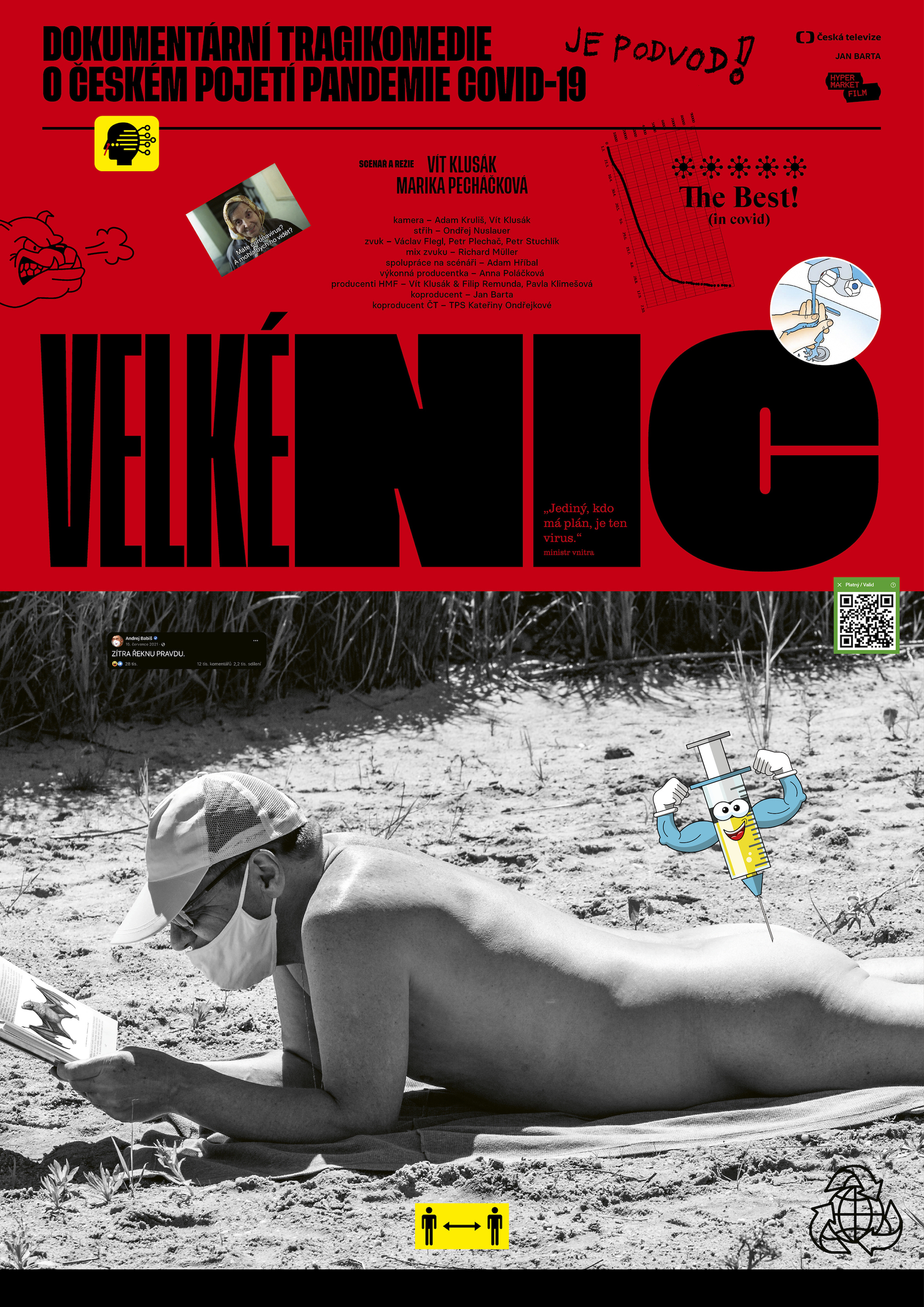 A pak nás napadlo tu blbou náladu porazit prací. A během pár dnů jsme se pustili do natáčení nového filmu. Do tragikomedie o českém pojetí pandemie Covid-19. Vláda ČR totiž zrovna nechala otevřít galanterie, aby si šikovní občané mohli nakoupit materiál na vlastnoručně ušité roušky. A my v tom zahlídli potenciál absurdního dramatu. Následující měsíce a desítky natáčecích dní v respirátorech a gumových rukavicích náš odhad potvrdily. Film se nakonec jmenuje VELKÉ NIC, protože nám přišlo důležité zdůraznit, že jedním z aspektů všech těch lockdownů bylo to náhlé velké prázdno, které je se stává prostorem pro nové a chytřejší směřování. Spíš jednotlivců, než společnosti - bohužel.