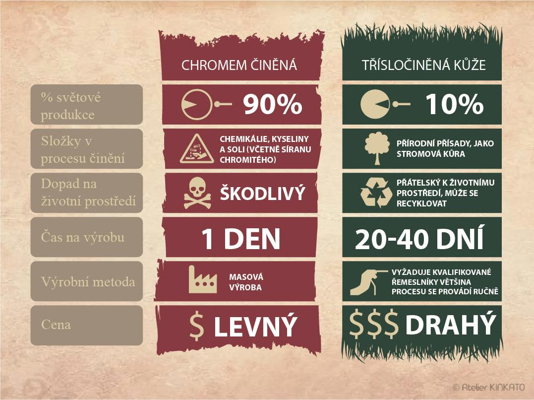 Pro naši výrobu jsme chtěli jen to nejlepší. Vsadili jsme na skvělou italskou a anglickou useň, která se vyrábí jako za starých časů, pomalým procesem bez použití chemie. Po staletí trval proces činění týdny až měsíce, ale s příchodem chemie, zejména chromu, je to otázka několika hodin. Přírodně činěná kůže se ve světě bohužel stává vzácností a tvoří méně než 10 % celkové produkce. Proto je velice drahá, ale o poznání kvalitnější. Výrobky z přírodně připravené kůže většinou nenajdete ani u těch nejluxusnějších značek. Zato ty naše budeme vyrábět bez chemie vždycky.