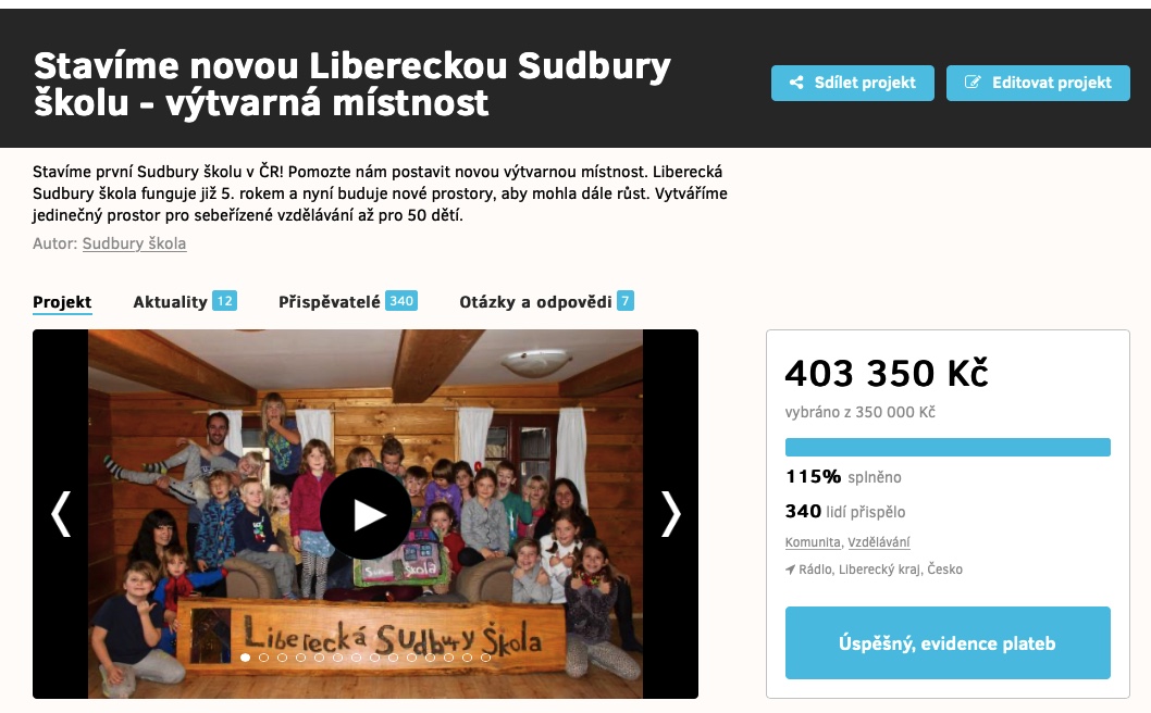 Celá kampaň byla pro nás všechny z Liberecké Sudbury školy především velkým povzbuzením do naší další práce a do vybudování jedinečných prostor pro sebeřízené vzdělávání stále většího počtu dětí. I když nám k dokončení celé budovy stále ještě peníze chybí, váš příspěvek nám pomůže uvést hned od počátku do provozu výtvarnou místnost.