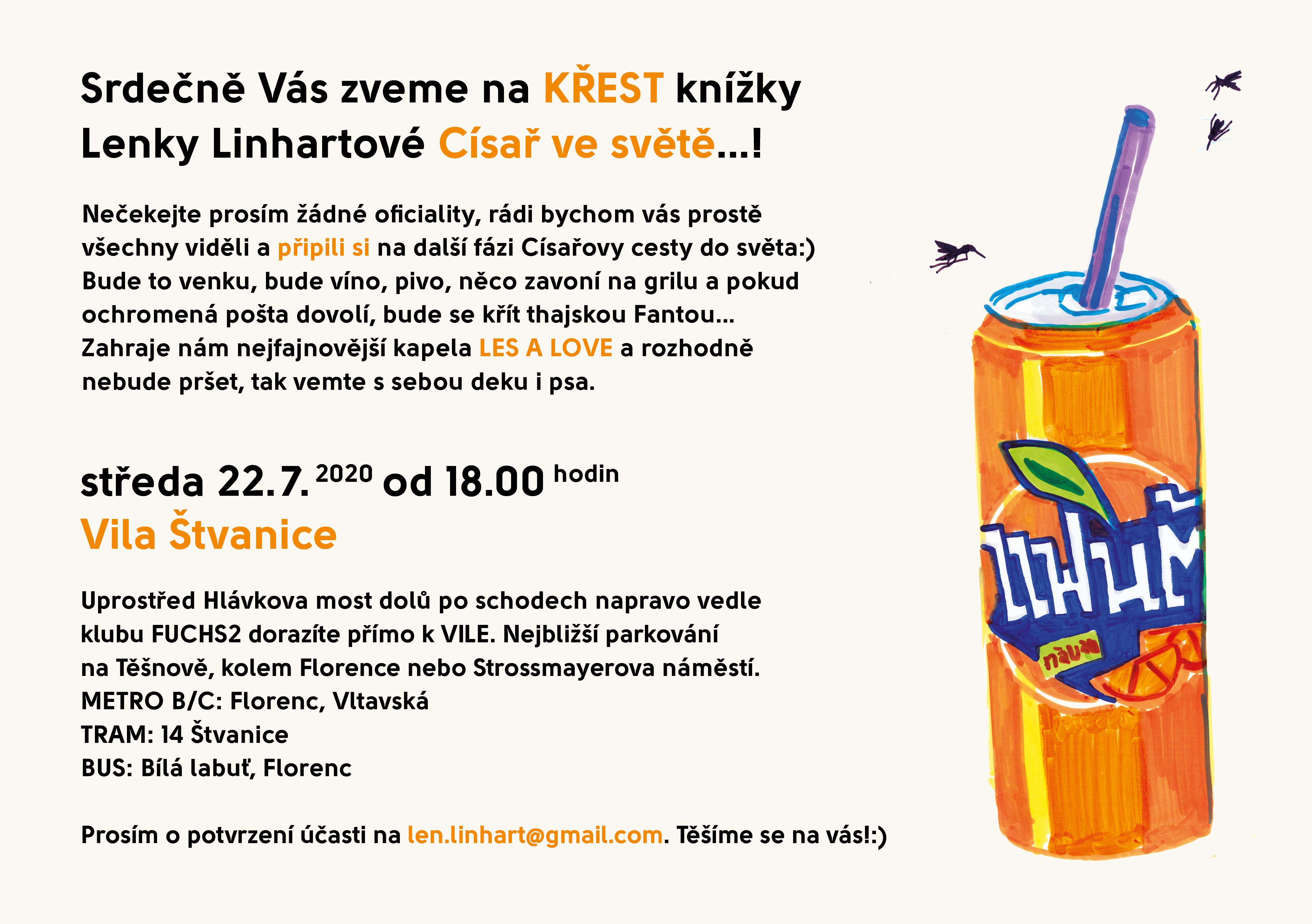 třikrát hurá, je to tak! Císař ve světě zdolal všechny překážky, doběhl do cílové rovinky a právě teď získává v tiskárně fyzickou podobu:))) To je samo o sobě velkým důvodem k oslavě, proto bychom vás všechny rádi pozvali na připravovaný KŘEST, který proběhne ve středu 22. července na Štvanici v Praze! Podrobné informace najdete na přiložené pozvánce, ale pokud se budete chtít ještě na cokoliv zeptat, neváhejte a napište mi prosím email nebo sledujte Císařský Facebook.