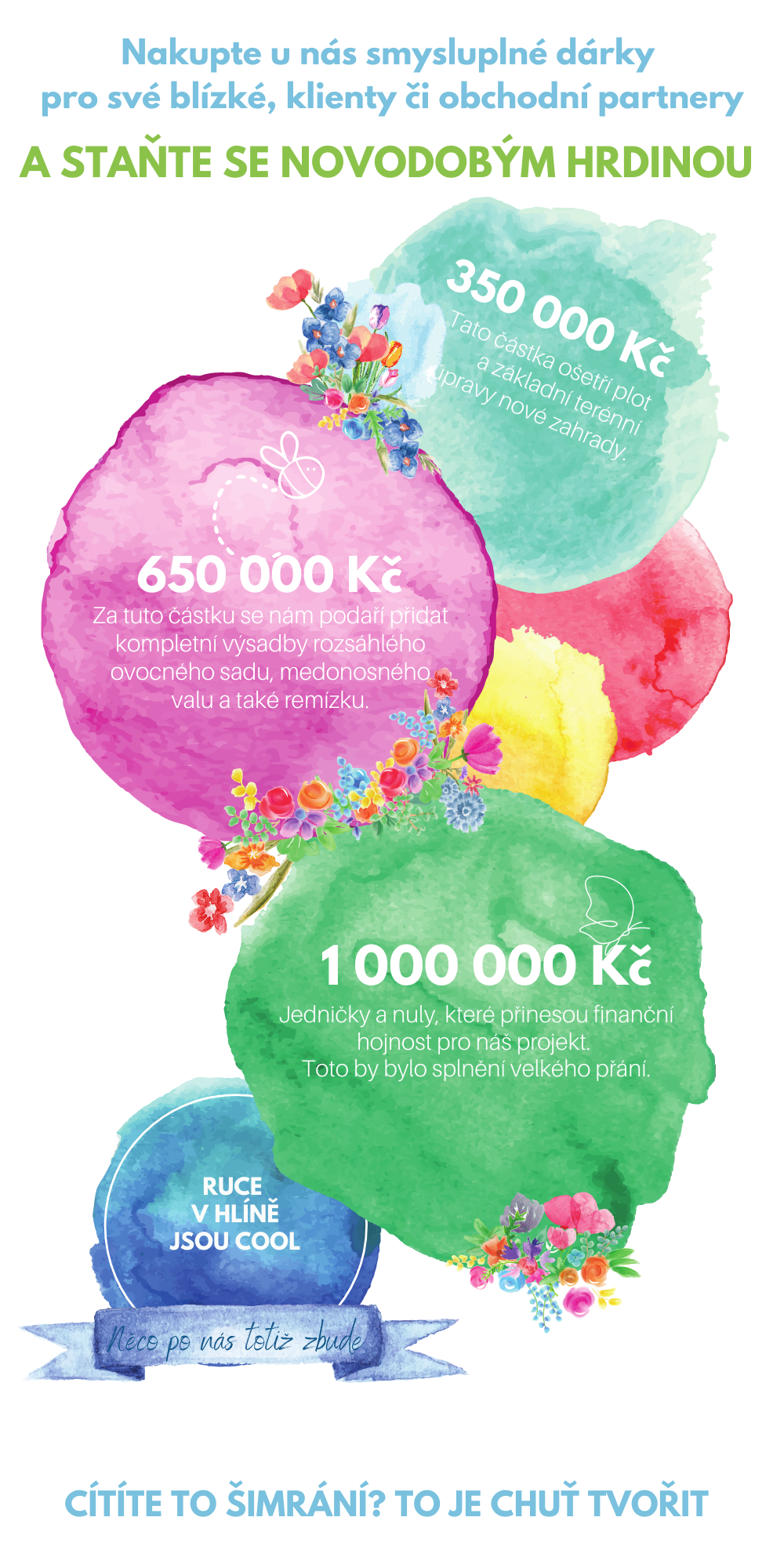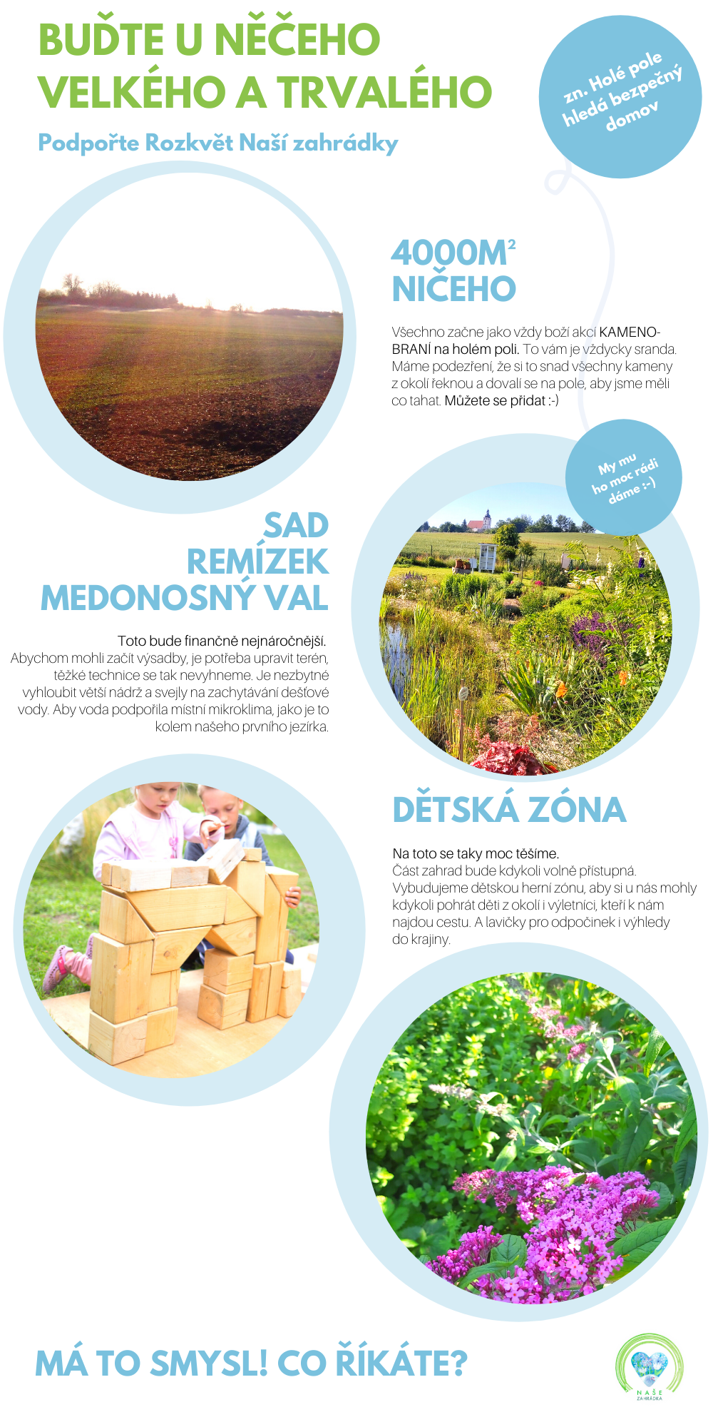 A je to tu zase! Stojíme opět před holým polem. Tentokrát ještě o kus větším, než bylo to první. Čeká nás přes 4000 m² NIČEHO. Máme energii, máme ruce, sílu a hlavně máme velkou touhu a chuť se do toho zase pustit. A co potřebujeme? 1 000 000 Kč, abychom mohli zrealizovat jeho proměnu v zelenou oázu. Průběžně investujeme do projektu Naše zahrádka vlastní finance, ale velikost nového pole vyžaduje větší objem finančních prostředků najednou. Proto jsme se rozhodli, pustit se znovu do Hithitu, kde vám nabídneme naše produkty a služby a výtěžek poputuje právě na Rozkvět Naší zahrádky.