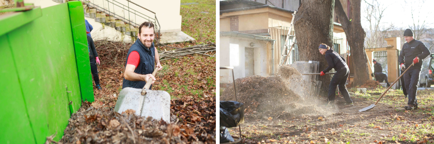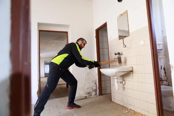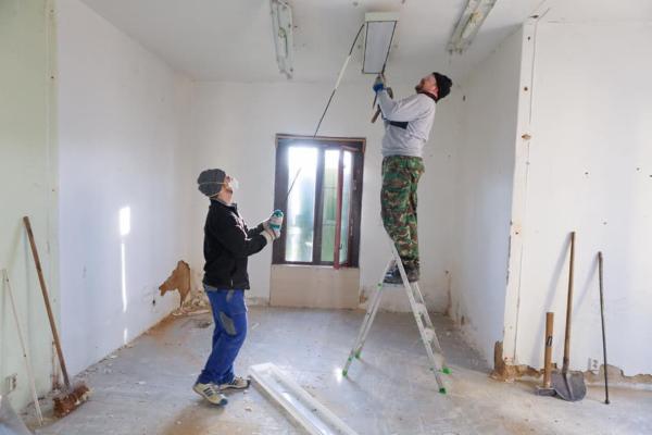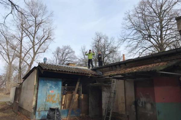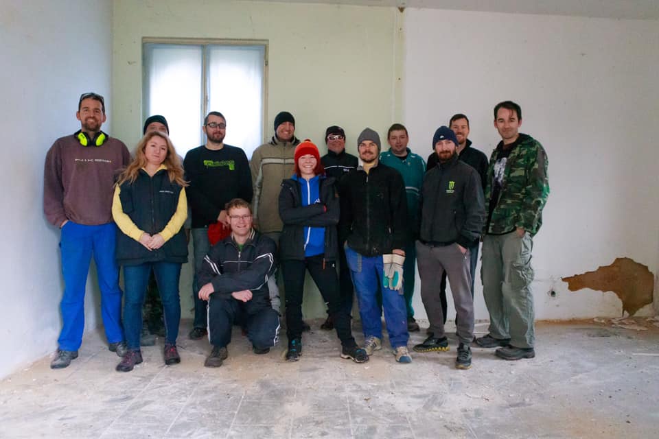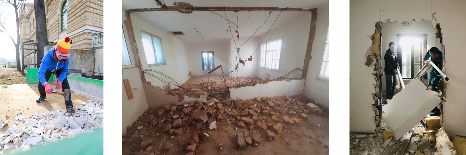 Už jsme zvládli vyklidit 4 tuny odpadu ze dvora, odstranit nevzhledný billboard ze střechy, okopat vnější vlhkou omítku, opravit část střechy, vyměnit okapy a svody, vybourat příčky a starou betonovou podlahu, udělat nové rozvody vody, odpadů a elektřiny a připravit rastry na stropní sádrokarton.