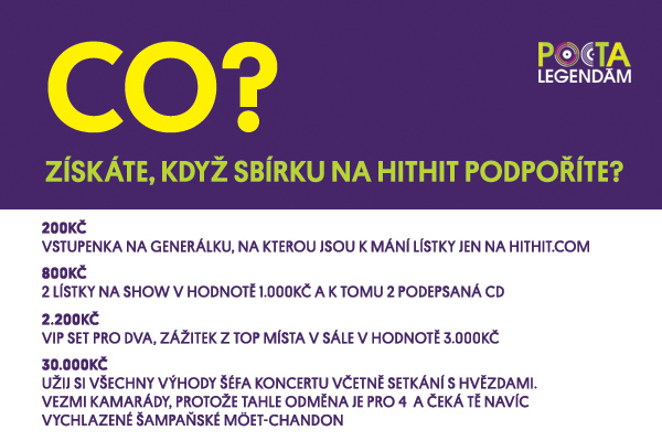 Vyhlasili jsme sbírku na hithit.com, protože nás baví hledat nové cesty a nechceme večer nechat v režii sponzorů, ale především fanoušků a vystupujících umělců. Jde nám prostě o to, udělat kvalitní zábavu a děkujeme všem, kdo nás v našem snažení podpoří.