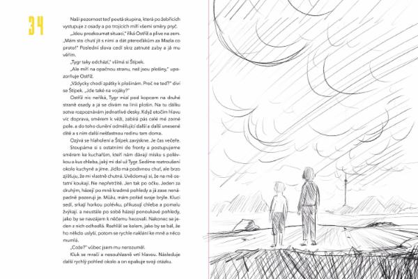 „Probudilo mě píchnutí, tady,“ dotýká se spánku v místě jizvy. „První, co jsem uviděl, byli ti strašní komáři všude kolem. Asi jsi je taky zahlédl. Začal jsem s nimi bojovat a nakonec jsem spadl z plošin dolů. Nechtěl jsem uvěřit tomu, co vidím! Pořád jsem si myslel, že je to zlý sen. Že jsem doma a spím ve své posteli. Štípal jsem se do stehna, až jsem bolestí křičel, ale pořád jsem se neprobouzel. A pak se objevil Tygr. Většinu z nás našel a zachránil Tygr. Hlídkuje pod plošinami, a když z nich někdo spadne, přivede ho sem. Ale já se ho tenkrát bál! Měl kopí a v první chvíli mi připadal jako nějaká příšera. Vrhl se na mě s tím svým nožem! Sedl si na mě a vyřízl mi pavouka. Řval jsem jako pominutý a stále jsem si myslel, že se mi to zdá, pral jsem se s ním. Odmítal jsem s ním jít dobrovolně, tak mě uvázal na provaz a táhnul za sebou, a když jsem nechtěl jít, jednoduše mě nesl a já jsem ho celou dobu kopal a rukama mlátil do zad.“