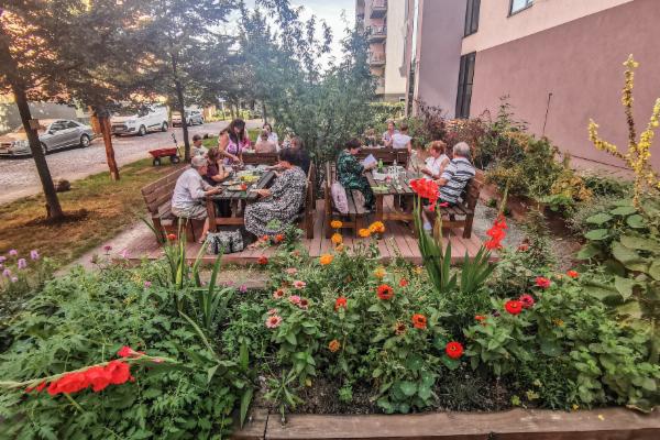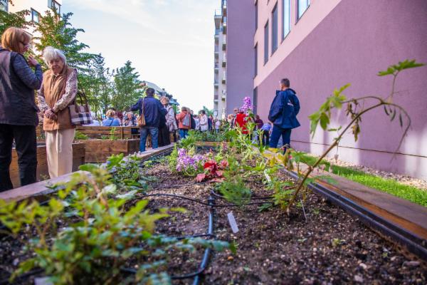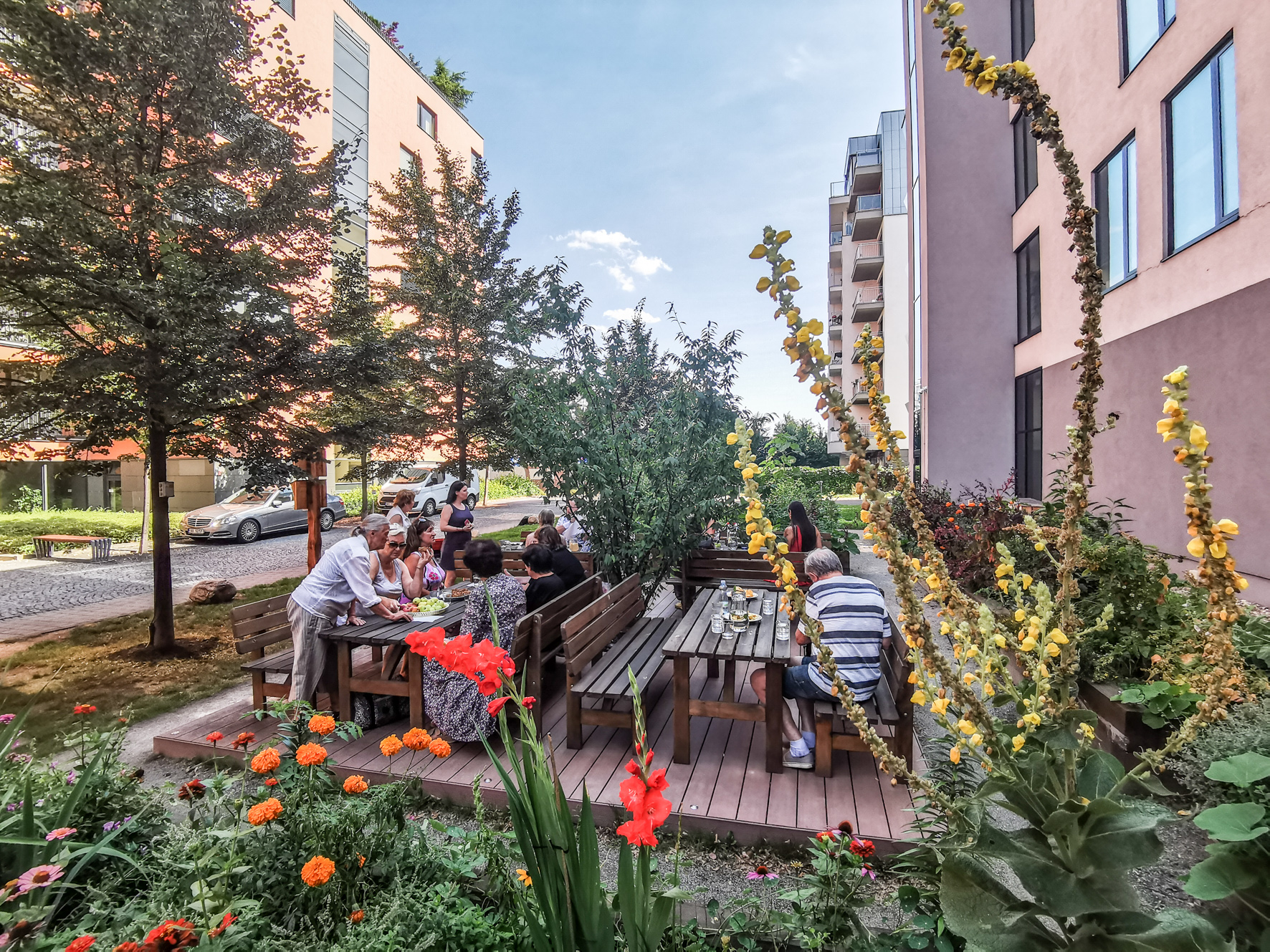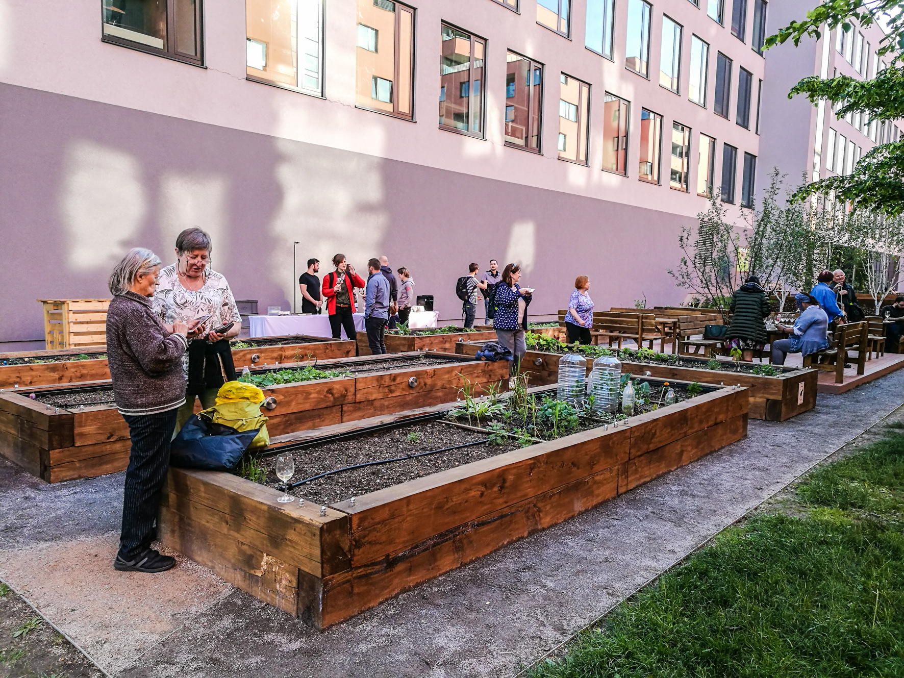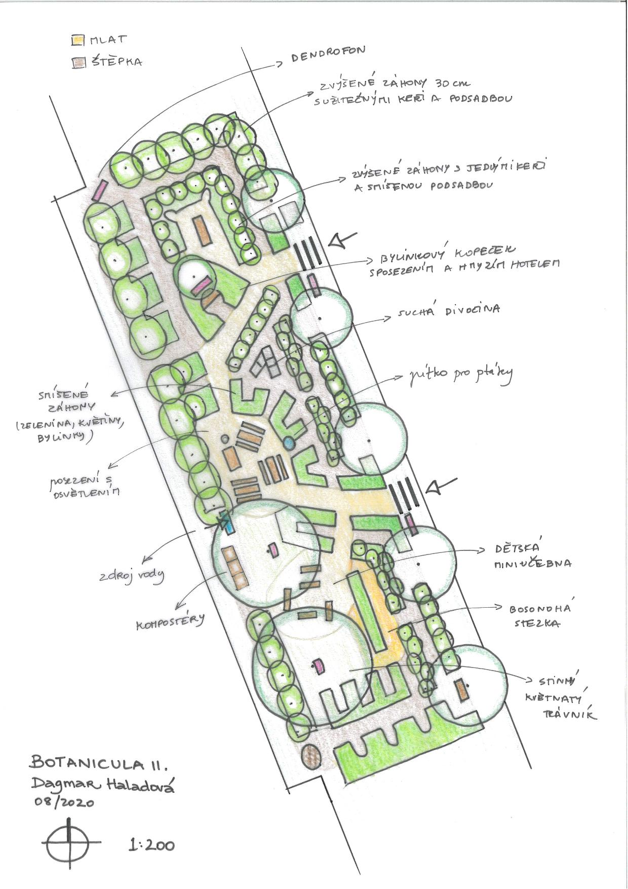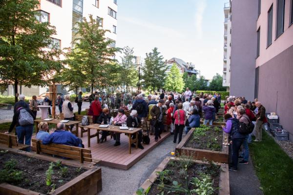 Vybudovat na ploše 400 m2 přírodní zahradu, která bude svojí skladbou co nejblíže přirozenému stavu v přírodě. Budou vysázeny pohromadě jednoletky, dvouletky, trvalky, květiny, zelenina, ovocné stromy a keře. Touto skladbou rostlin zvýšíme biodiverzitu, proměníme mikroklima, zvětšíme možnost ochrany a pastvy pro ptáky a hmyz. Uprostřed velkoměsta tak vznikne prostředí vhodné pro pozorování hmyzu i ptáků, učebnice přírody, kterou budou využívat senioři a děti z okolních mateřských i základních škol. Keřové patro bude v proluce mezi domy zároveň sloužit jako větrolam.