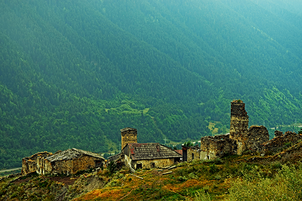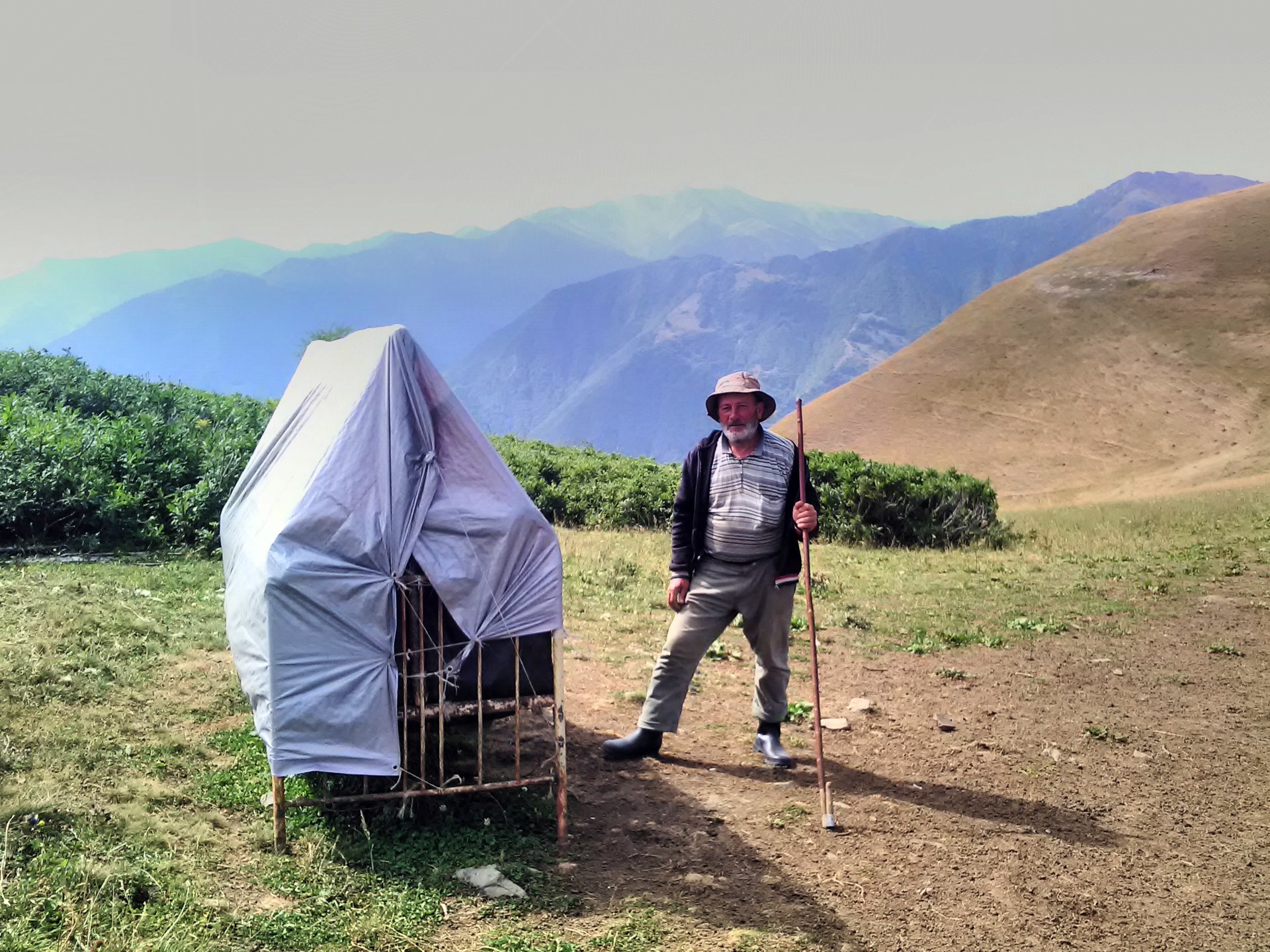 Doprovází mě pastvinou k salaši. Rezavá postel ve výšce dva tisíce metrů nad mořem, nad ní je do áčka vypnutá plachta a celé to stavení si stojí jen tak na louce. Neukotvené, ničím nepodložené. „Tak tady bydlím,“ ukazuje mi své obydlí, „půl roku pasu své ovce, půl roku pracuju jako ochranka na ragbyovém stadionu ve Tbilissi.“ „Tady spíte? A kde máte normální salaš?“ „Tam dole je kamenná salaš, ale ta slouží jako sklad. Je tam spousta harampádí, jen si tam chodím pro věci. Bydlím tady.“ Žasnu. „To je perfektní! Corbusieur hadr, toto je architektura, dělaná pro člověka!“ zvolám s lehkou nadsázkou, poněvadž málo domů je tak krásných jako ty Courbusieurovy. Kdybych si ale měla vybrat mezi některým z domů výjimečného architekta a starou železnou postelí tady v horách, nerozmýšlela bych se příliš. „Můžu si vás vedle vašeho nádherného obydlí vyfotit, prosím?“ žádám pastevce, který hned ochotně zapózuje. Foťák se mi včera rozbil pádem ze srázu, takže vytáhnu mobil a pořídím snímek. „Víš co? Zůstaň tu přes noc. Když se ti ta moje postel tolik líbí, tak v ní můžeš spát. A já si lehnu pod širák s ovcemi.“ povídá. „A na tvoji počest zaříznu berana!“ dodá nadšeně. Nevím, jestli mě víc vyděsila nabídka trávit noc s pastevcem nebo to, že bych způsobila předčasnou smrt nebohého zvířete. „Děkuju, ale to nejde. Strašně spěchám, můj manžel právě přiletěl do Tbilisi a čeká tam na mě.“ vytahuju argument svého fiktivního manžela. Mám snubní prsten, nad jeho fotkou v mobilu se dovedu zaníceně rozplývat, znám jeho životopis a dovedu bez váhání odpovědět na všeliké otázky, které mi pokládají ti, kdo jeho existenci zpochybňují. Aby mě to aspoň trochu bavilo, mám těch fiktivních manželů v zásobě několik – vždycky si vyberu toho, na nějž mám zrovna náladu. Když pastevec pochopí, že mě nepřesvědčí, pozve mě aspoň na oběd. „Tak se zdrž aspoň chvíli, dáme si spolu kus sýra.“ Pokračujeme níž, k té jeho kamenné salaši, která slouží jako sklad. Opravdu je tam tolik harampádí, že by se tam ležící člověk nevešel. Sedneme si na sudy, vypijeme kávu a pustíme se do tvrdého chleba se sýrem. Máme oba úplně stejný nůž a porovnáváme si, kdo ho má lépe naostřený. Chvíli se pozdržím, aby měl radost, že má společnost, daruju mu pohlednici a pak pospíchám dolů k silnici. Za manželem.