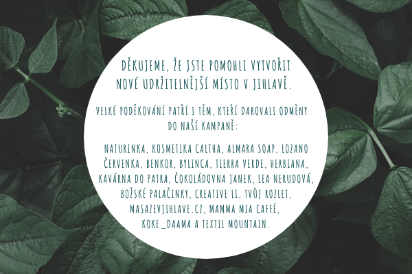 Děkujeme: Naturinka - tradiční mýdlárna, Kosmetika Caltha, Herbiana, Bylinca, Tierra Verde, Almara Soap, Lozano Červenka, Kavárna Do patra, Benkor, Čokoládovna Janek, Textil Mountain, Lea Nerudová, Tvůj rozlet, CreativeLi a Masáže v Jihlavě.