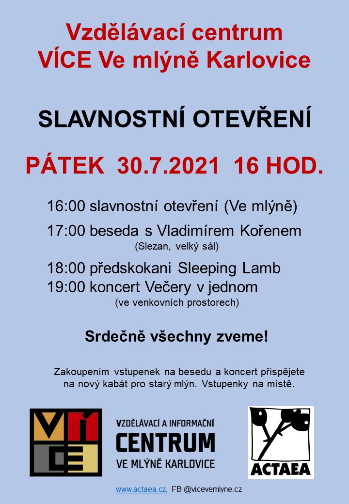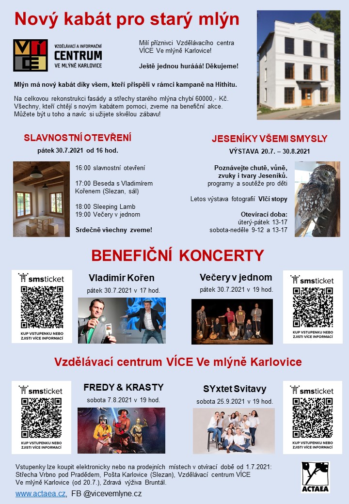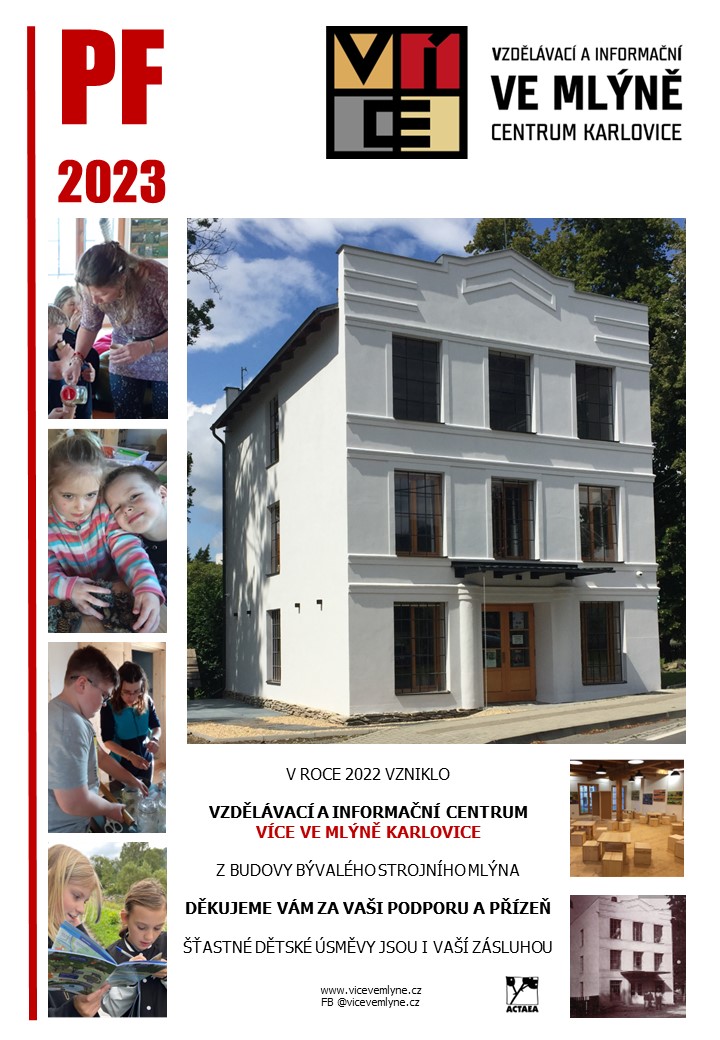 V Karlovicích se v pátek 30.7.2021 slavnostně otevřelo Vzdělávací centrum VÍCE Ve mlýně Karlovice. Bylo tak završeno několikaleté úsilí spolku Actaea – společnost pro přírodu a krajinu, který centrum provozuje. Kromě vnitřních prostor a vybavení centra, na něž se podařilo získat dotaci, byla proměněna také vnější podoba budovy starého mlýn díky Vašim příspěvkům.