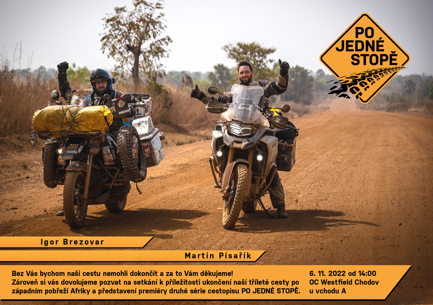 Přijďte na setkání s hlavními aktéry našeho cestopisu, které proběhne v OC Westfield Chodov. Setkat se budete moct nejen s Martinem a Igorem, ale i se zbytkem štábu který je na cestách doprovázel. Můžete si poslechnout zážitky z jejich cest, jaká milá či nemilá překvapení je potkala a bude i prostor na vaše dotazy. Můžete se podívat, jak vypadá "Bublák", nebo jak dopadlo naše vybavení po tom co jsme projeli celou Afrikou. Bude připravená i možnost projet se na motorce po Africe díky VR, nebo si poslechnou Martinovo sólo na kytaru.