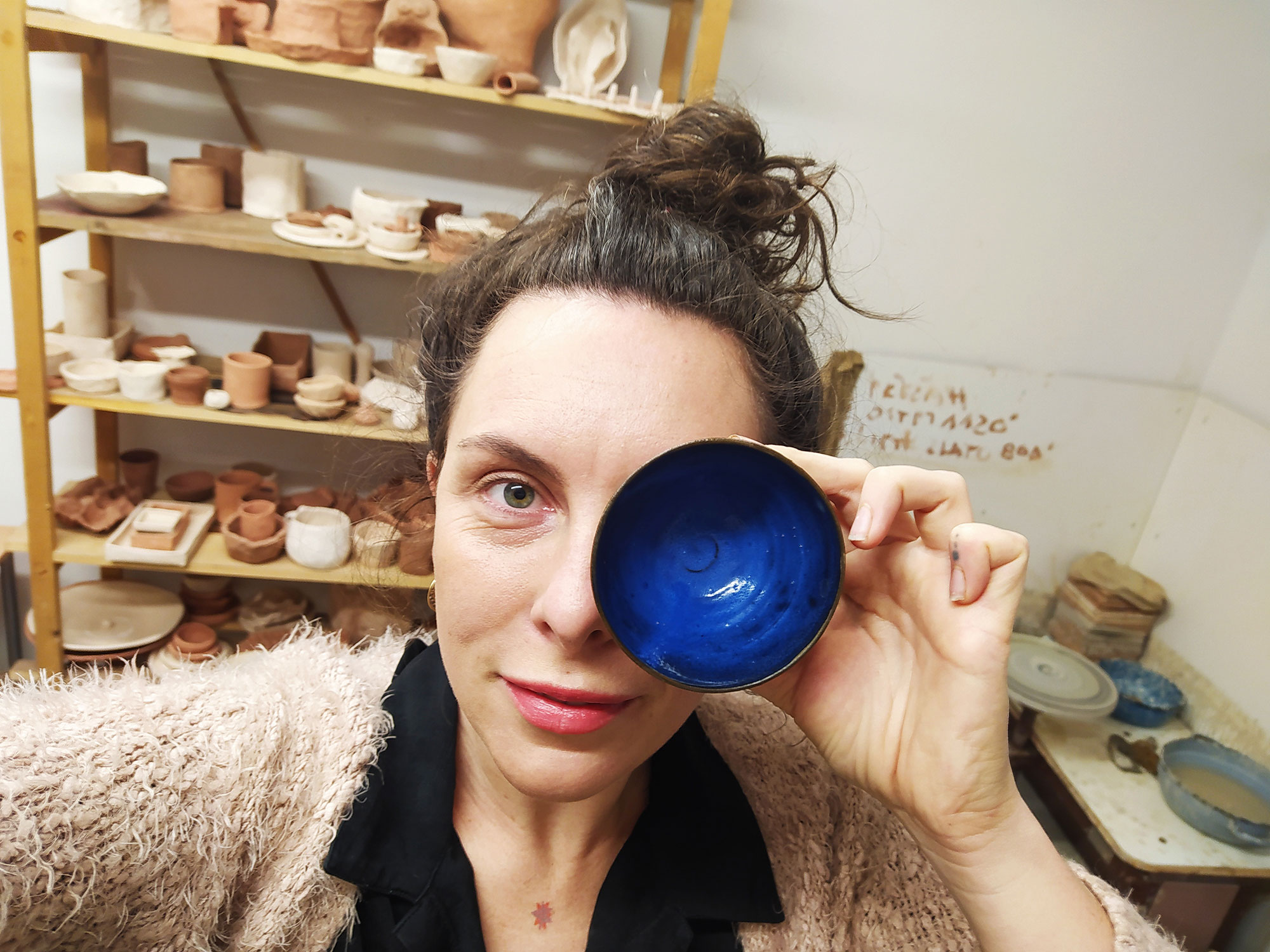 Ručně točené hrnky na hrnčířském kruhu z černé kameniny. Zevnitř glazované, z venku zemitě přírodní. Každý se liší tvarem a glazurou. Glazuru jsme zvolili modrou, krémovou a černomodrou.