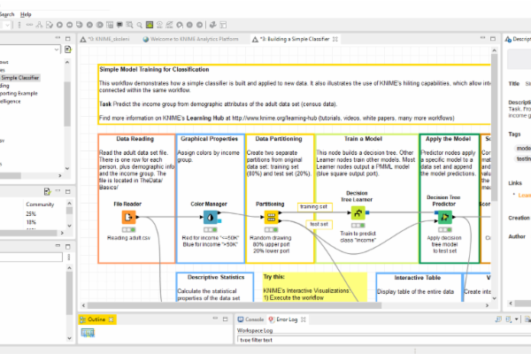 Pokud je analytikovi programování a kódování cizí, nemusí si nutně zoufat, že datová věda není pro něj nebo pro ní. KNIME umožní celý model „naklikat“. U každého uzlu představujícího aktivitu je možnost nastavení specifického dané aktivitě. Sám program má značné množství ukázkových workflow, z něhož lze doslova okoukat, jak se softwarem pracovat nebo použít jako template.