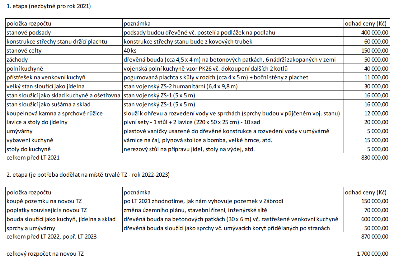 Abyste měli představu, co všechno tvoří vybavení TZ a kolik to stojí, přikládáme zjednodušený rozpočet, který je rozdělený na dvě části. V první části je uvedené vybavení, které potřebujeme zajistit už nyní, aby mohl letošní tábor vůbec proběhnout, ve druhé je vše ostatní k vybudování plně funkční základny, která by šla v budoucnu pronajímat na další běhy jiným táborníkům. Z nájmů se pak budou dávat peníze na stranu“, aby bylo z čeho financovat údržbu TZ a obnovu vybavení.