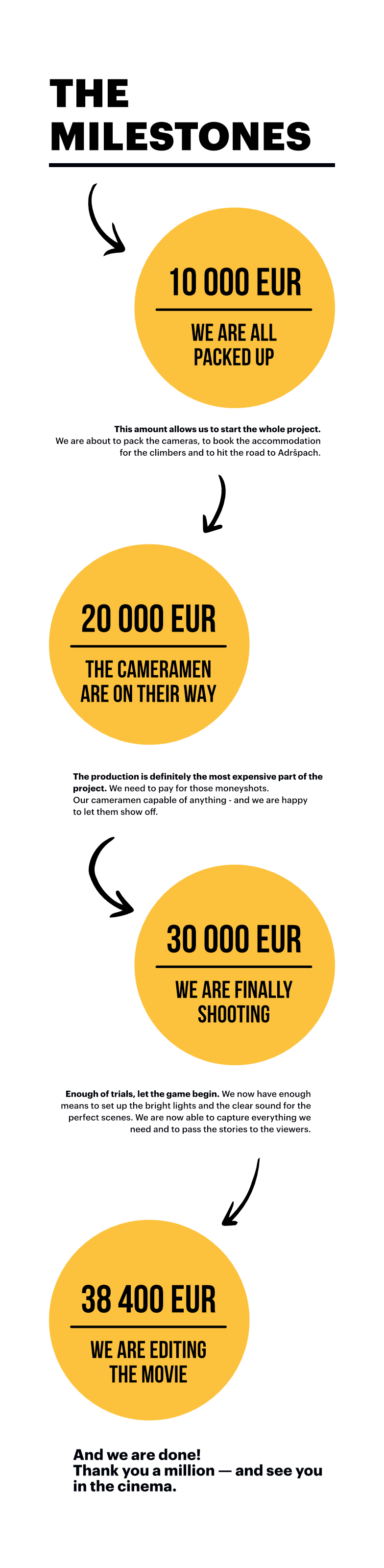 We are climbers. We are filmmakers. Our cameramen are up to literally anything. This movie will be our dream fulfilled. It will connect together the two things we love the most. Our project has already caught the attention of the Czech-German fund. The fund has kindly provided some money - but the key amount is still missing. And that's why we need you.