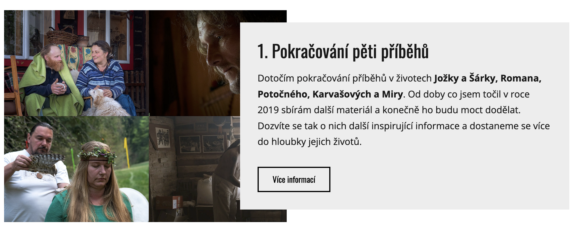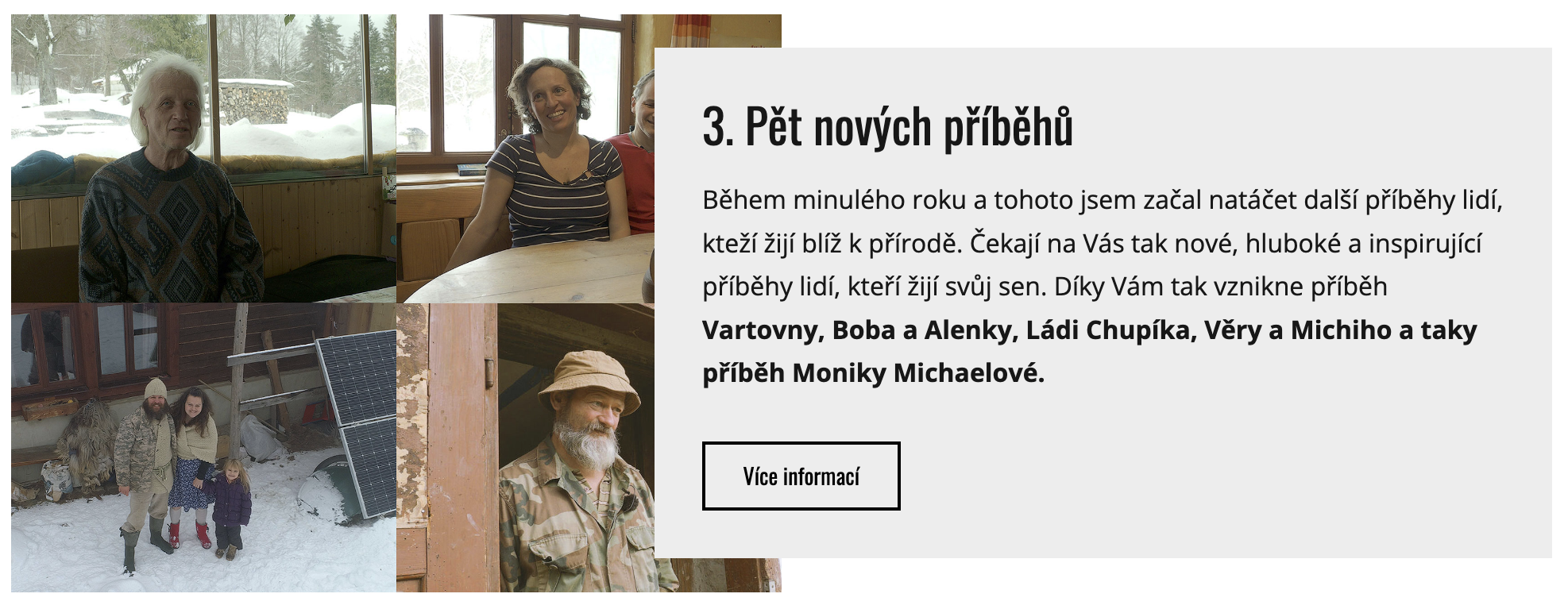 Souběžně s tím pokračuji v natáčení příběhů lidí, kteří mají podobnou cestu jako my. Odešli z města, aby žili blíž k přírodě. Náš projekt tak postupně dostává nové obrysy a vzniká tak něco, co jsme ani my sami na začátku netušili. Dostáváme zprávy od lidí, které naše cesta a příběhy, které jsme natočili, podporují k tomu, aby si dovolili jít za svým snem. Udělali důležité životní změny.
