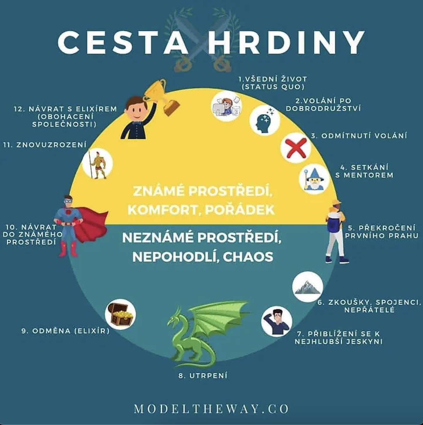Pomohl mi také terapeutický výcvik a koncept CESTY HRDINŮ, který vytvořil J.Campbell. Ten v minulém století popsal tento nadčasový a nadgenderový koncept, který vznikl rozborem vzorců chování tisíců hlavních protagonistů významných příběhů, bájí, pověstí a mýtů, které se napříč kulturami po celém světě linou. Všichni jsme se s nimi setkali - ať již z knižních příběhů či populárních filmů a seriálů jako je Neo z Matrixu, Harry Potter, Frodo z Pána prstenů, ale také Hermiona z Harryho Pottera, Xena (Princezna bojovnice), Pipi Dlouhá punčocha, Wednesday a celá řada dalších...