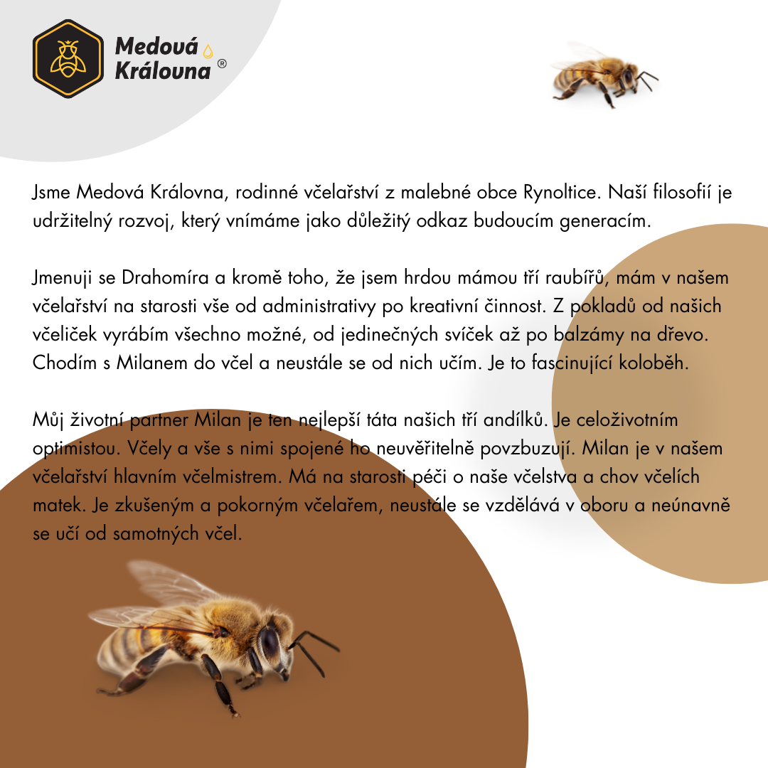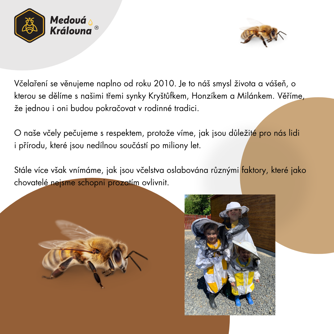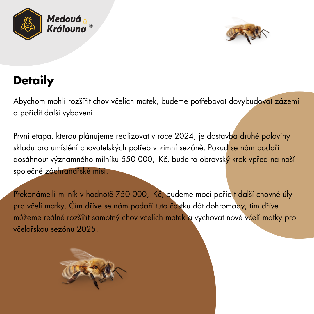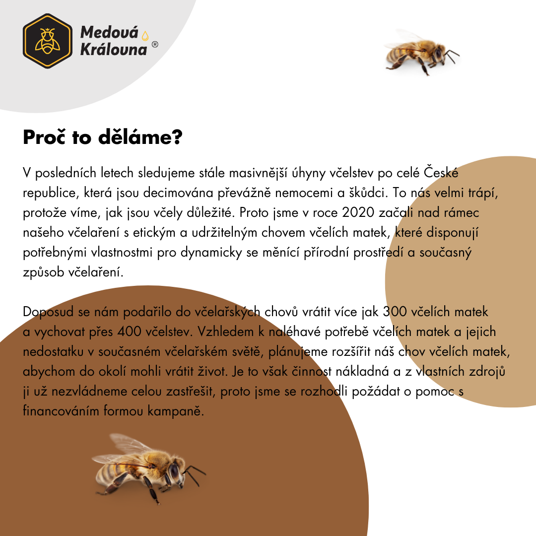 Záleží Vám na přírodě a na budoucnosti dalších generací? Pojďme se spojit a zachránit včely. Náš projekt se zabývá chovem včelích matek. Vracíme do chovů nová včelstva, aby v důsledku jejich masivních úhynů nedocházelo k významným změnám biodiverzity.