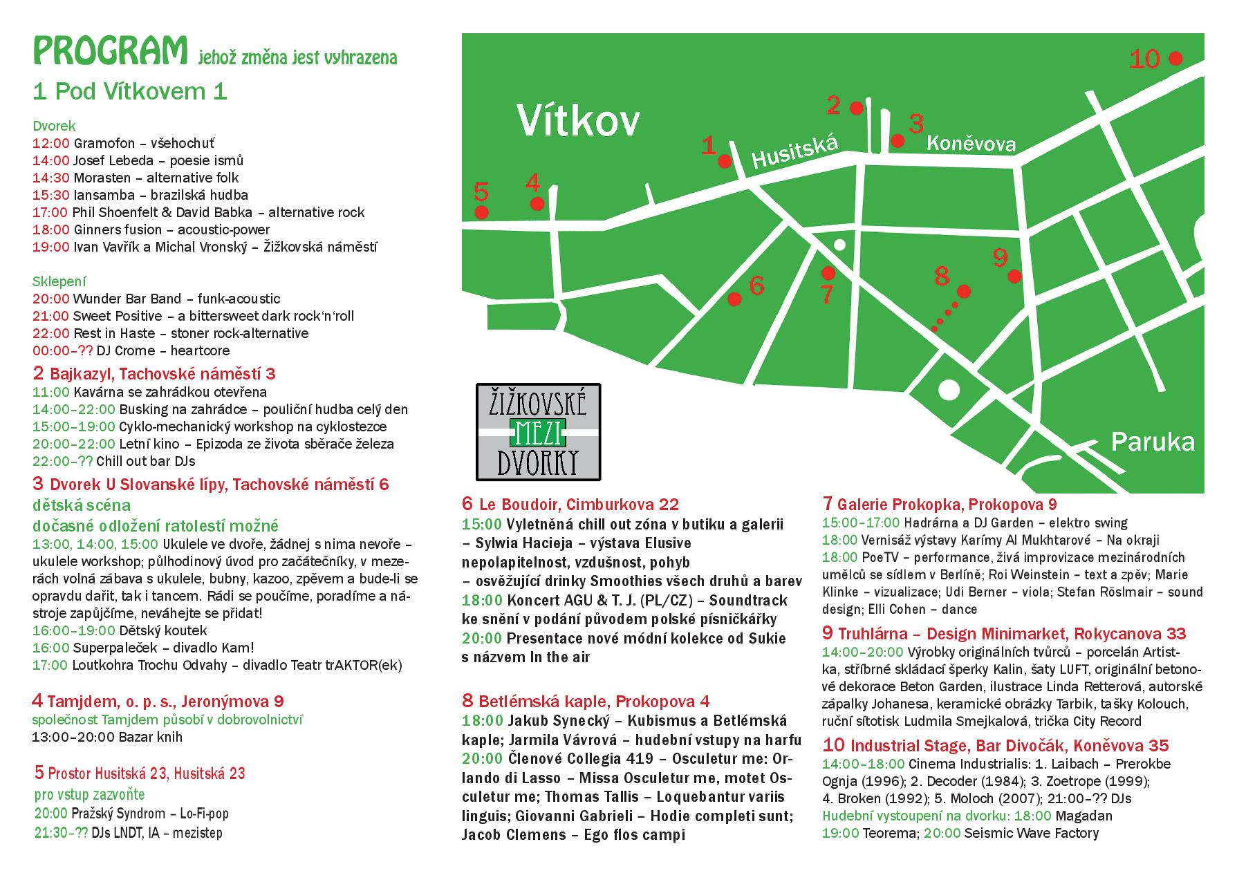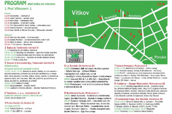 Možná i k vám se dostaly zkazky o legendárním undergroundovém festivalu Malostranské dvorky a stejně jako my jste si představovali, jak nedočkaví návštěvníci hledají v mapce tajemná zákoutí a dvorky, které nyní již nadobro zmizely či kompletně změnily svou tvář. Když jsme pak přemýšleli, jak tuto dobu i atmosféru alespoň na pár hodin vrátit, bylo jasné, že Malá Strana v tom hlavní roli hrát nebude a protože Žižkovu se mj. říká Malá Strana pravého břehu Vltavy, bylo jasno.