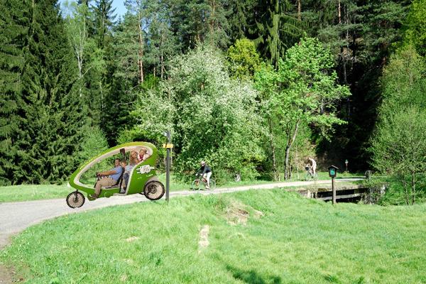 Příklad: Z/do Kyjovského údolí vás z Krásné Lípy doveze E-rikša a průvodce v jedné osobně? Auto necháte u hotelu. Nebo si E-Rikšu zapůjčíte na celý den sami.