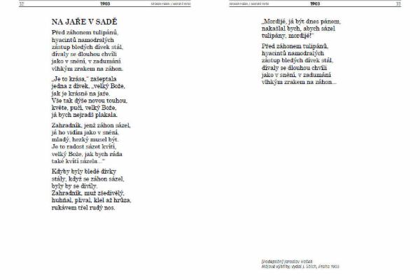 Takto Haška málokdo zná. V první, ucelené sbírce vydaných i zcela neznámých básní se prolíná celý Haškův krátký, ale pestrý život. Doplněno dobovými fotografiemi, vysvětlivkami, komentáři. Ocení obdivovatelé Haškova díla, literární a historičtí badatelé.