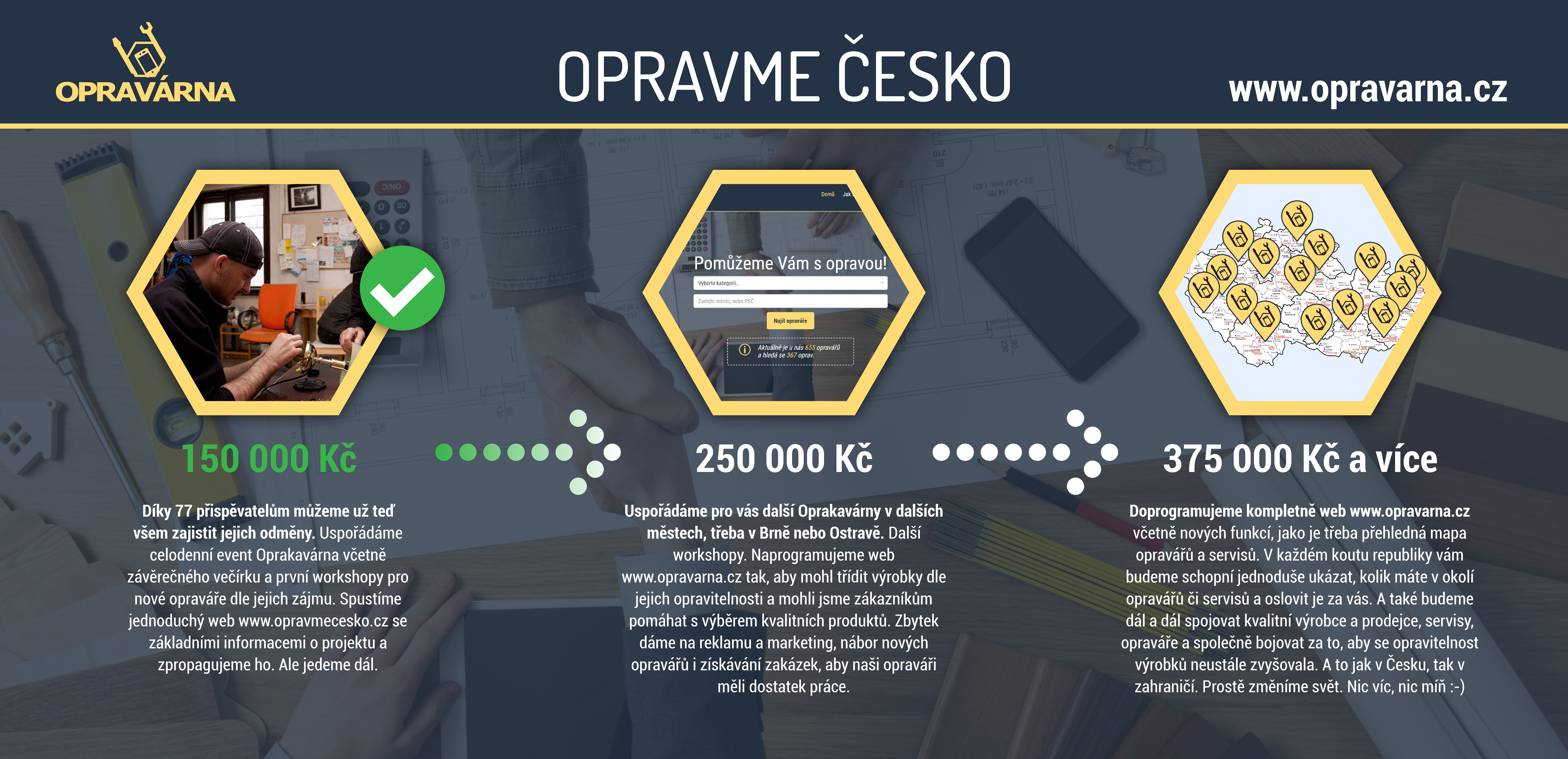 Tak se nám během 15 dní povedlo splnit cíl. Všem Vám tedy pošleme slíbené odměny, necháme naprogramovat stránku projektu Opravme Česko a začneme usilovně pracovat na propojování všech (firem, servisů, lidí,..), kteří se do projektu chtějí zapojit. Zvyšovat počet opravářů i zakázek. Ale ještě máme dost času, tak jsme si stanovili cíle další. Máme dost zakoupených odměn na uspořádání první Oprakavárny a workshopů. Rádi bychom jich ale udělali po republice více. Také ještě budeme muset hodně programovat, aby web uměl vše, co potřebujeme. Je to spíš cíl nereálný, ale dáme 250 000 Kč? Jo a přidali jsme novou odměnu pro firmy, které by chtěly být sponzory celého projektu.