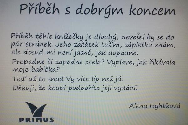 Alena Hyhlíková. Pracuji jako lékařka. Měla bych léčit nervy, neboť jsem neurolog. Snažím se, a občas se to i daří, léčit nemocné lidi. Ale co když je nemocný doktor? Už Agatha Christie napsala, že doktoři by neměli být nemocní, že je to jaksi nepatřičné. Ale stane se. Tedy, co má dělat doktor nervový, když je nemocný? Je-li na nervy? Má-li naraženou duši? Neumím malovat, tančit ani meditovat, a tak se léčím psaním. A vařím si čaj.
