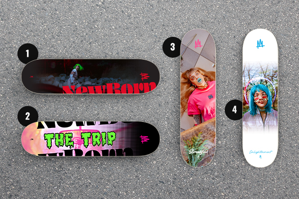 Skateboardové desky. V poznámce odměny nezapomeňte uvést číslo 1 až 4 podle vybraného designu. Ohledně velikosti desky vás budeme kontaktovat.