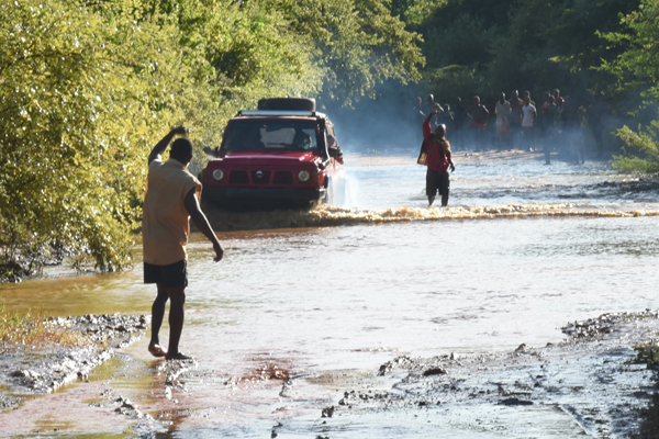 V závěru se už potmě dostáváme k inkriminovanému místu, co jsme viděly na fotkách. Totálně zaplavená silnice, asi sto metrů, místy tak do pasu hluboká voda. Do vody se jako první pouští Otík a místní kluci vysvlečení do spodků, aby ukázali, kde je voda jak hluboká, a prošlapávají dno, aby zjistili, kde je pevné a kde rozbředlé. Ve světle reflektorů auta tak vidíme jen horní části těl pohybujících se ve vodě a různě gestikulujících a pokřikujících na sebe.