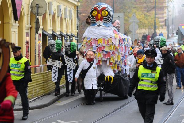 Lidé si myslí: jeden průvod, jedno odpoledne. Ale co všechno je za tím! Náš tým začíná připravovat další ročník ještě než skončí ten předchozí. Během zimy připravujeme katalog a výstavu uplynulého ročníku, zjara oslovujeme iniciativy a výtvarníky, kteří už v létě vybírají témata a jejich vizuální zpracování. Již ke konci léta organizujeme Burzy nápadů, kde se vytvoří nové týmy (vždy iniciativa, výtvarník a dramaturg) a ti začínají spolupracovat. Nu a od září jedou dílny na plné obrátky. Účastníci a další spřízněné duše chodí do dílen a mnoho hodin a dní vymýšlí formu, kašírují masky, staví konstrukce, píší pamflety. Během října a listopadu to u nás bzučí jako ve včelím úle. I v roce 2015 chceme dílnami a programem zabydlit a oživit neznámý prostor a vytvořit Sametové centrum 2015.