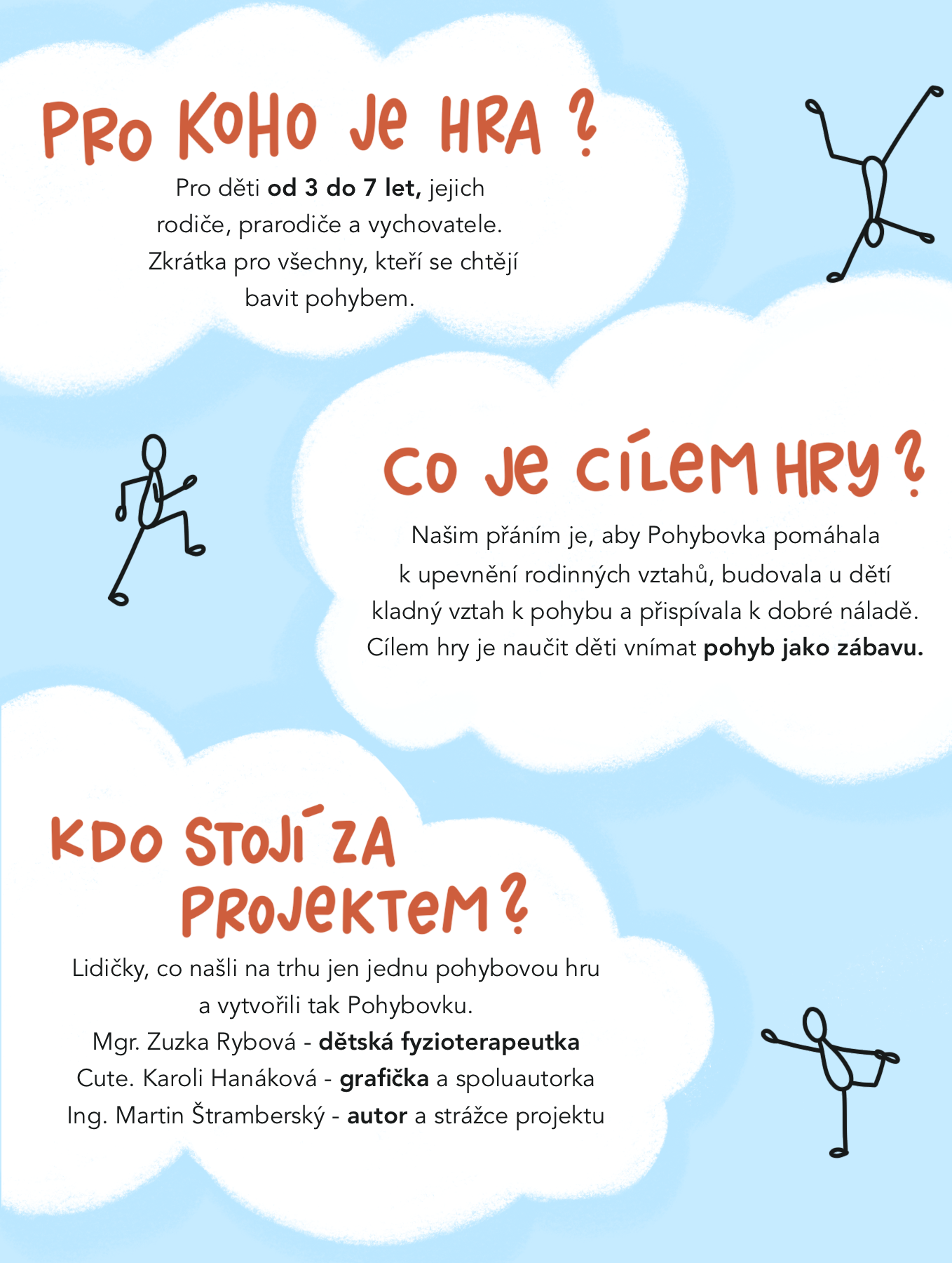 Současná 1. verze “Příběhy“ hry Pohybovka je českým produktem vyrobeným ve spolupráci s 3 chráněnými dílnami. Chceme podporovat českou výrobu, pohyb a aktivní trávení času rodičů s dětmi. Pro rozjezd potřebujeme 380 000 Kč na výrobu a vývoj dalších zajímavých verzí pro hráče různých věkových kategorií.