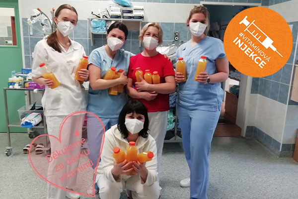 Projekt #vitaminovainjekce již od března 2020 rozdává čerstvé vitamíny do nemocnic a rozvezla již 21 600 vitamínových drinků. Hlavním cílem je doplnit přetíženým lékařům, zdravotním sestrám, záchranářům a dalším zdravotníkům potřebnou energii a vitamíny. Zároveň jim tak vyjádřit poděkování za jejich práci a dodat čerstvou šťávu do dalších dnů. A co vlastně vitamínová injekce je? Je to 500 ml čerstvé ovocné šťávy s maximem zdraví prospěšných látek, především vitamínů.