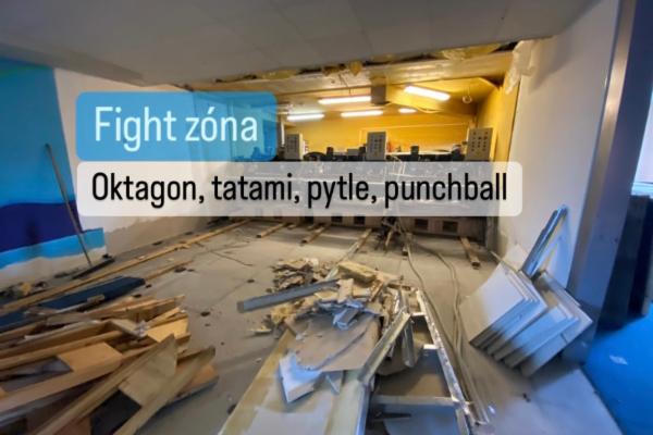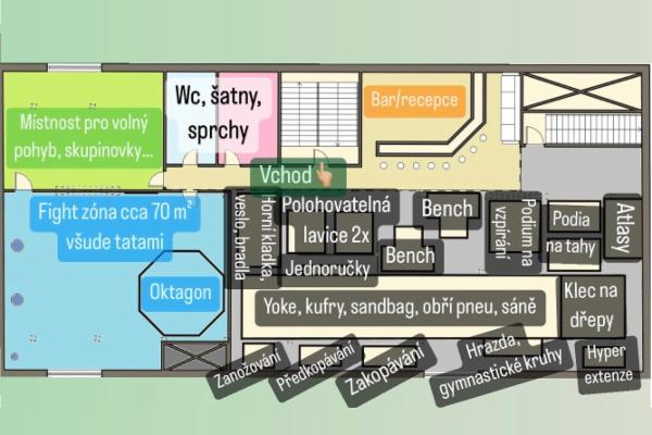 140m² velká posilovna s veškerým vybavením pro pořádný silový trénink. Více jak 70m² oddělená fight zóna s tatami, oktagonem a boxovacími pytli. Dalších oddělených 60m² vyhrazené pro volný pohyb, skupinové lekce a podobně.