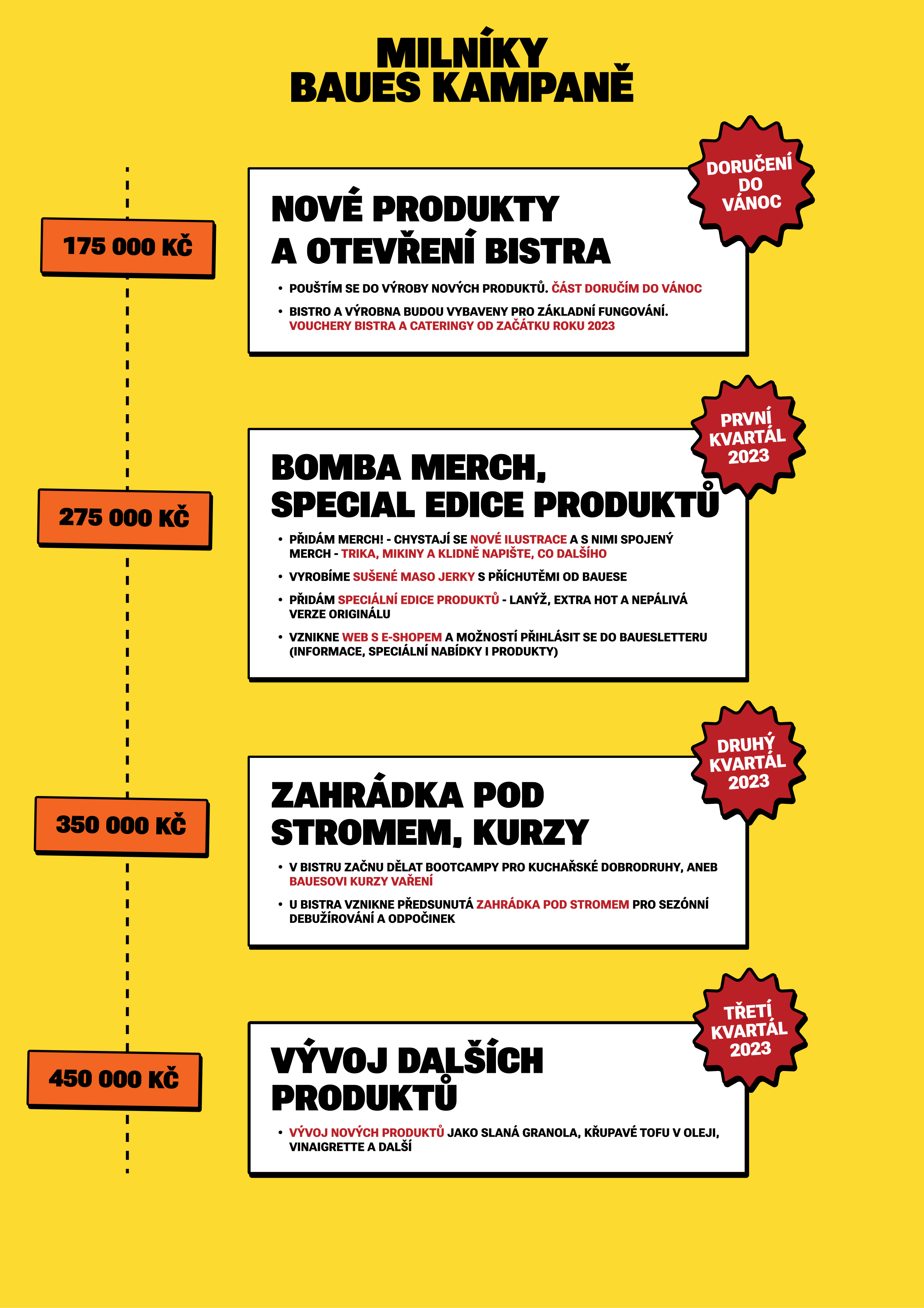 Po 17 dnech kampaně se nám podařilo dosáhnout prvního a velmi důležitého milníku kampaně. Skvělé, krásné, boží! Moc vám děkuju za podporu a důvěru. Kampaň tím, ale zdaleka nekončí! Věřím, že by se mohlo povést skvělé energie a rozjeté kampaně využít k tomu, aby se o bistru a mých dochucovadlech dozvědělo ještě víc lidí a radost z komplexních chuťových zážitků se šířila na nová místa. Pro přehlednost jsem připravil orientační milníky, abyste věděli na co se můžete dál těšit a k čemu mi vaše nákupy odměn pomohou.