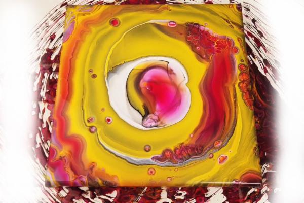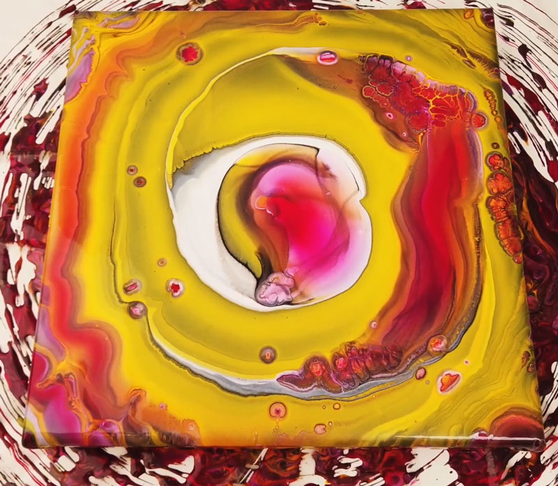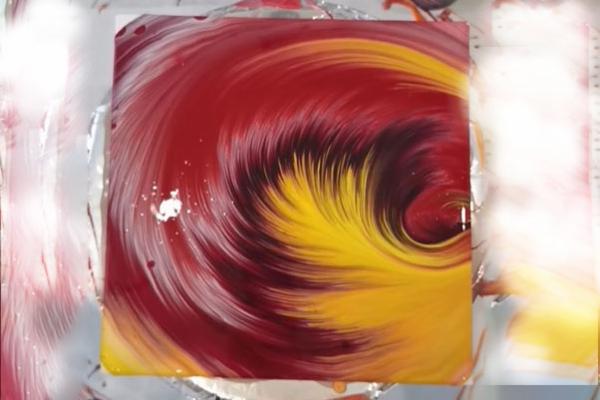 Plátno si položíte na otočný stůl, do nádoby si vložíte barvy a můžete začít! Je už jen na vás jak. Můžete nejprve roztočit stolek a následně polévat plátno barvami nebo naopak. Nebo můžete jen plátno polévat a k vytvoření zajímavých map využít třeba fén.