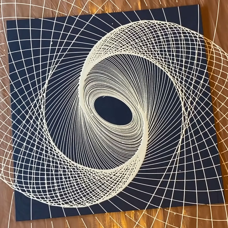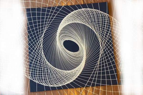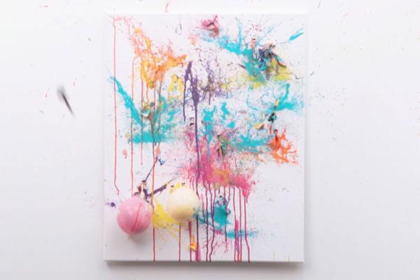 Do zavěšené nádoby tvořící kyvadlo umístíte barvy dle své volby. Kyvadlo následně roztočíte a necháte pracovat gravitaci.