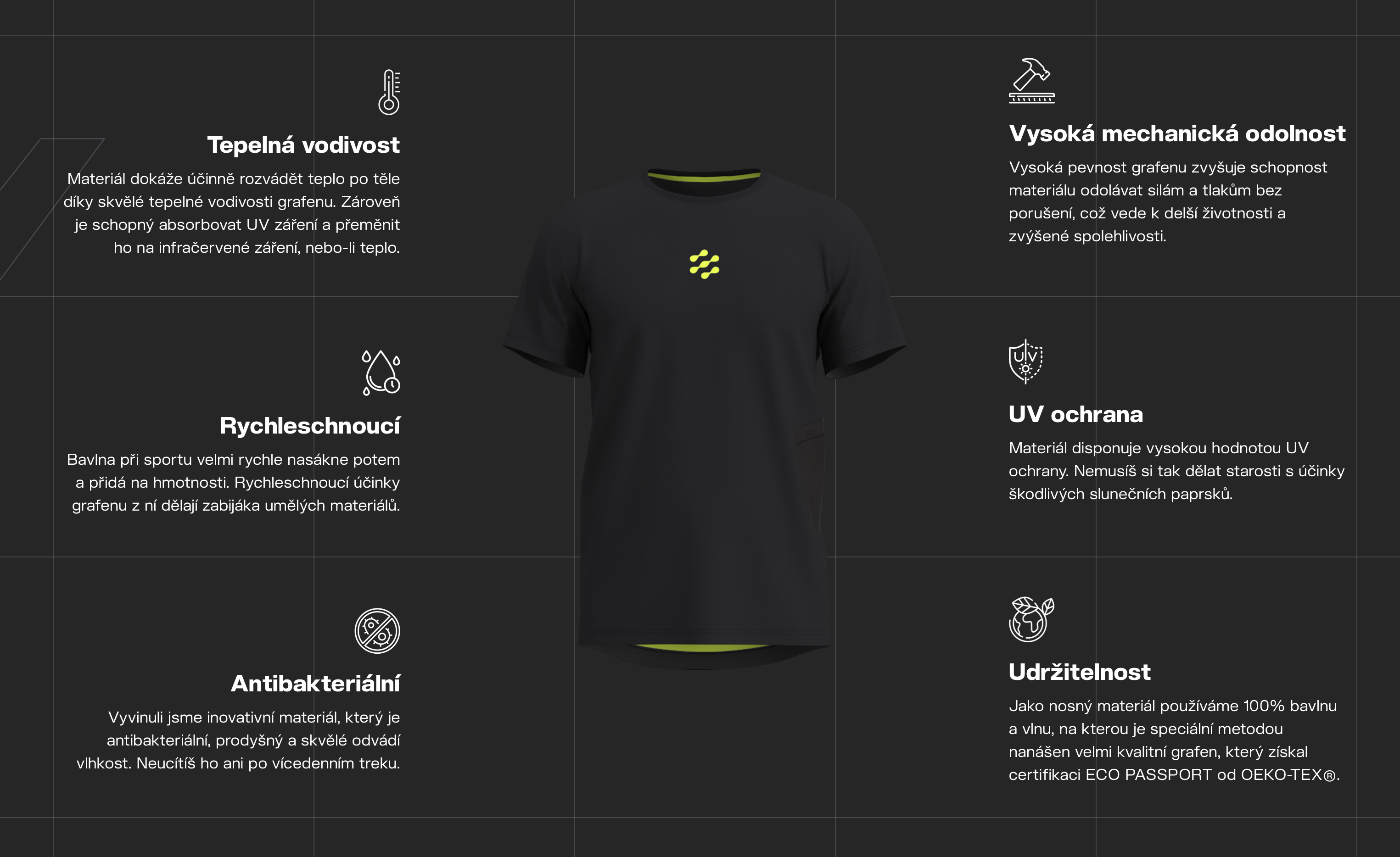 Vytvořili jsme revoluční koncept sportovního oblečení s ohledem na životní prostředí. Hlavním prvkem této technologie je grafen, nanomateriál, který posouvá hranice nejen v textilním průmyslu. Pojďme společně nastartovat přechod k udržitelné budoucnosti !