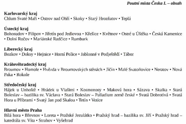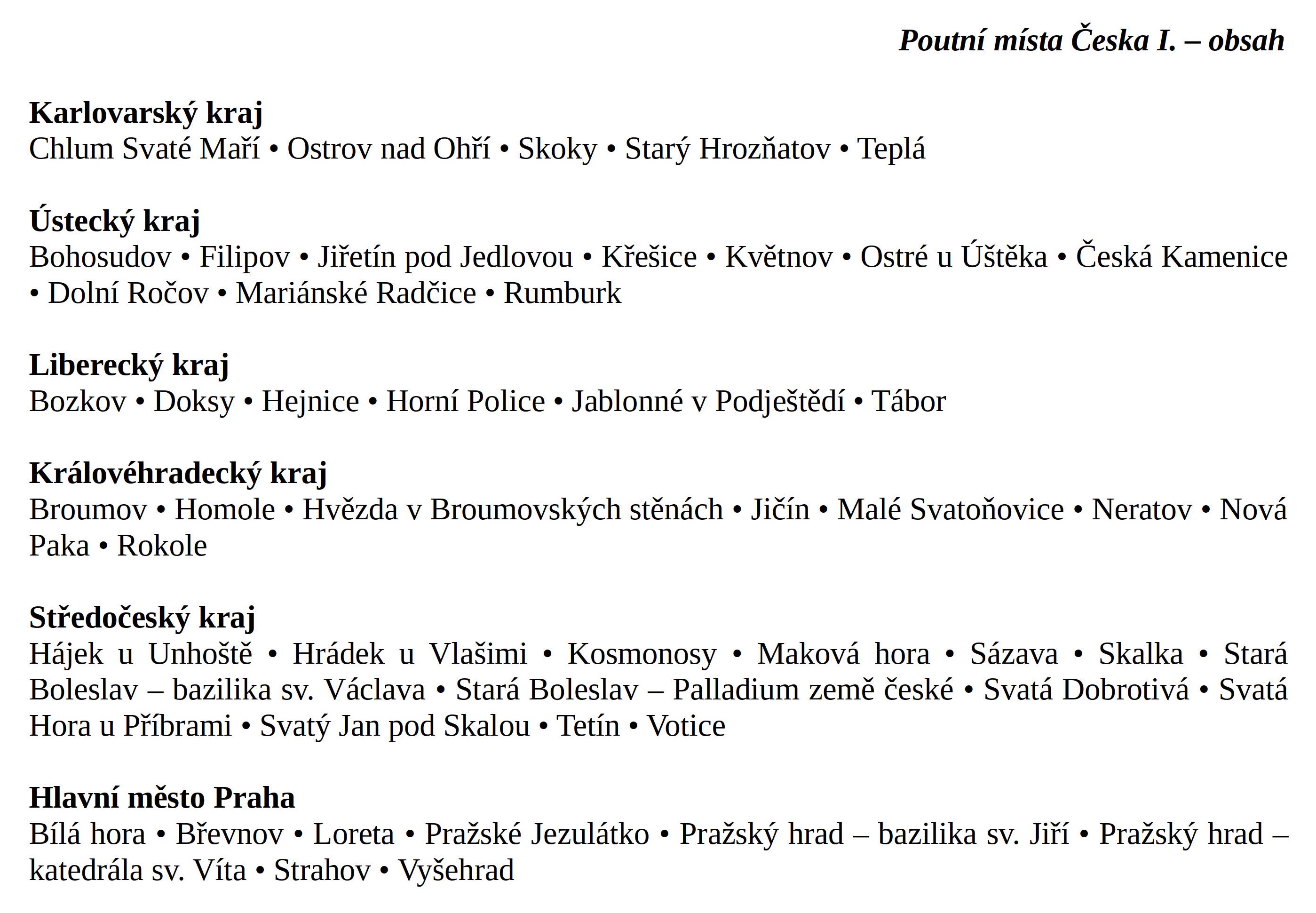 Knižní průvodce Poutní místa Česka I. bude celobarevnou publikací cestovatelského formátu A5 s vazbou V4. Kniha bude mít 250 stran, na nichž najdete 50 poutních míst ze šesti našich krajů (viz obsah níže). Každé heslo bude doprovázet aktuální fotografie exteriéru i interiéru příslušného poutního místa; v textu se dozvíte zakladatelskou legendu, stručnou historii poutního místa a chybět nebude ani popis současného stavu. Finanční prostředky vybrané v kampani Hithit budou využity na vydání této knihy. Celé dílo právě dokončuji.