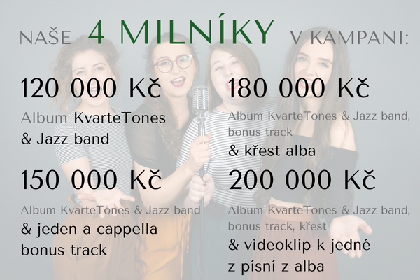 Vydáváme naše první album a potřebujeme vaši pomoc! Jsme dívčí vokální kvartet, který zpívá vlastní aranže známých i méně známých písní především swingového žánru. Nyní plánujeme vydat CD za doprovodu kapely a speciálních hostů. Pojďte do toho s námi!