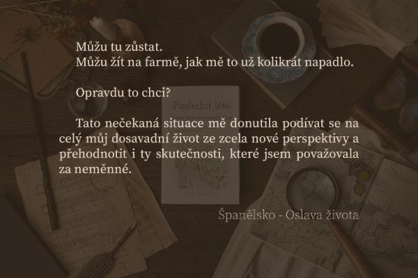 Knihu Poslední léto - Cesta, která mi změnila život jsem napsala především sama pro sebe, abych na svou pouť nikdy nezapomněla. Mohla by však inspirovat i vás na cestě za poznáním, a přesně proto je teď tady připravená se s vámi setkat.
