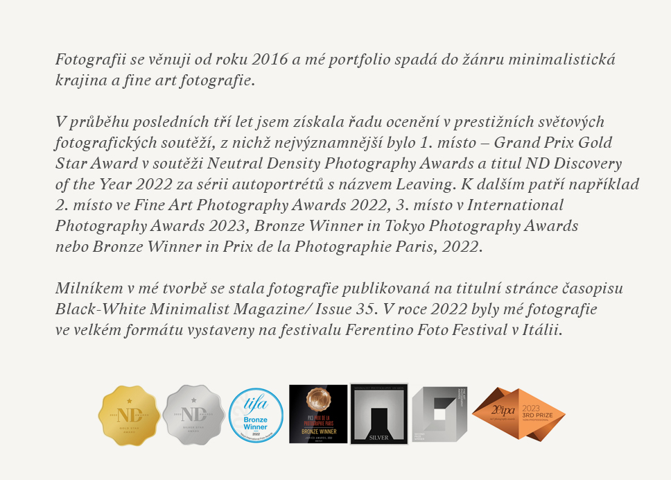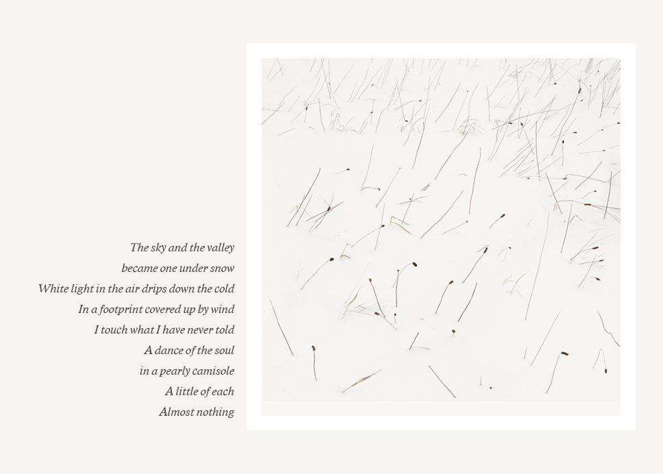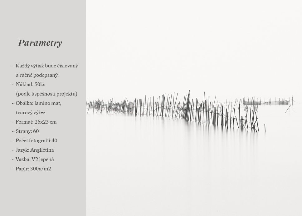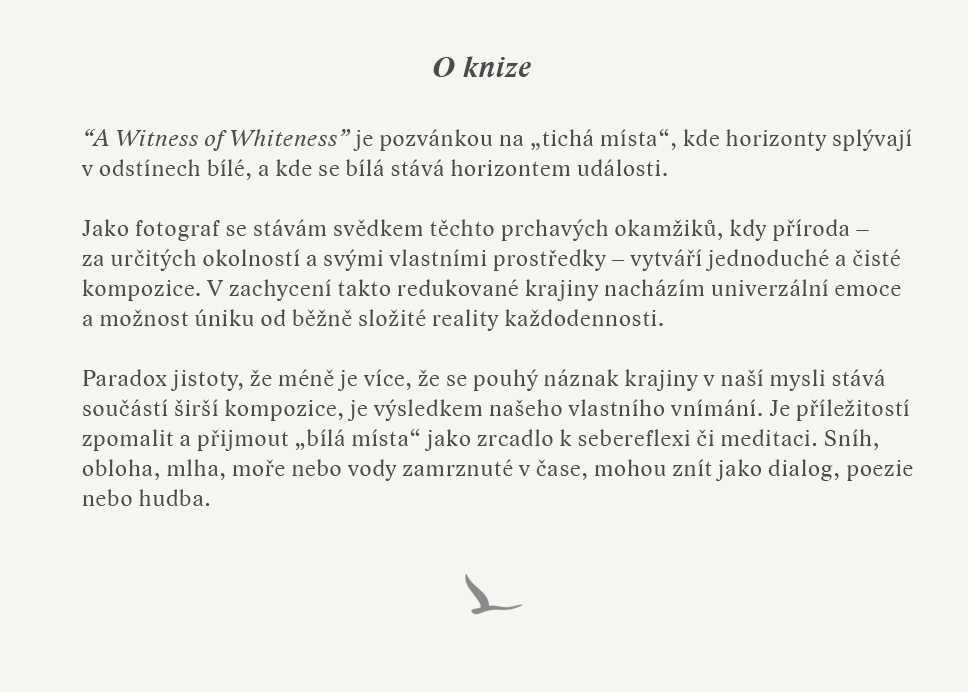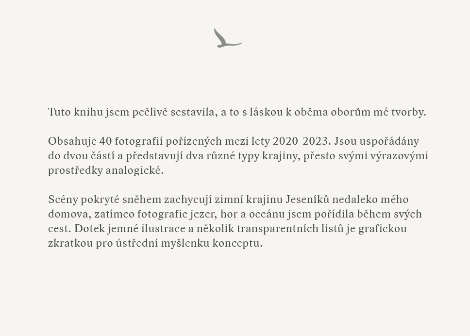 Limitovaná edice autorské knihy fotografií české ilustrátorky, grafičky a fotografky Evy Chupíkové. Kniha je pozvánkou na „tichá místa“ krajiny minimalismu. Čistý elegantní design doprovází křehká ilustrace a špetka poezie. Kniha vychází v angličtině.