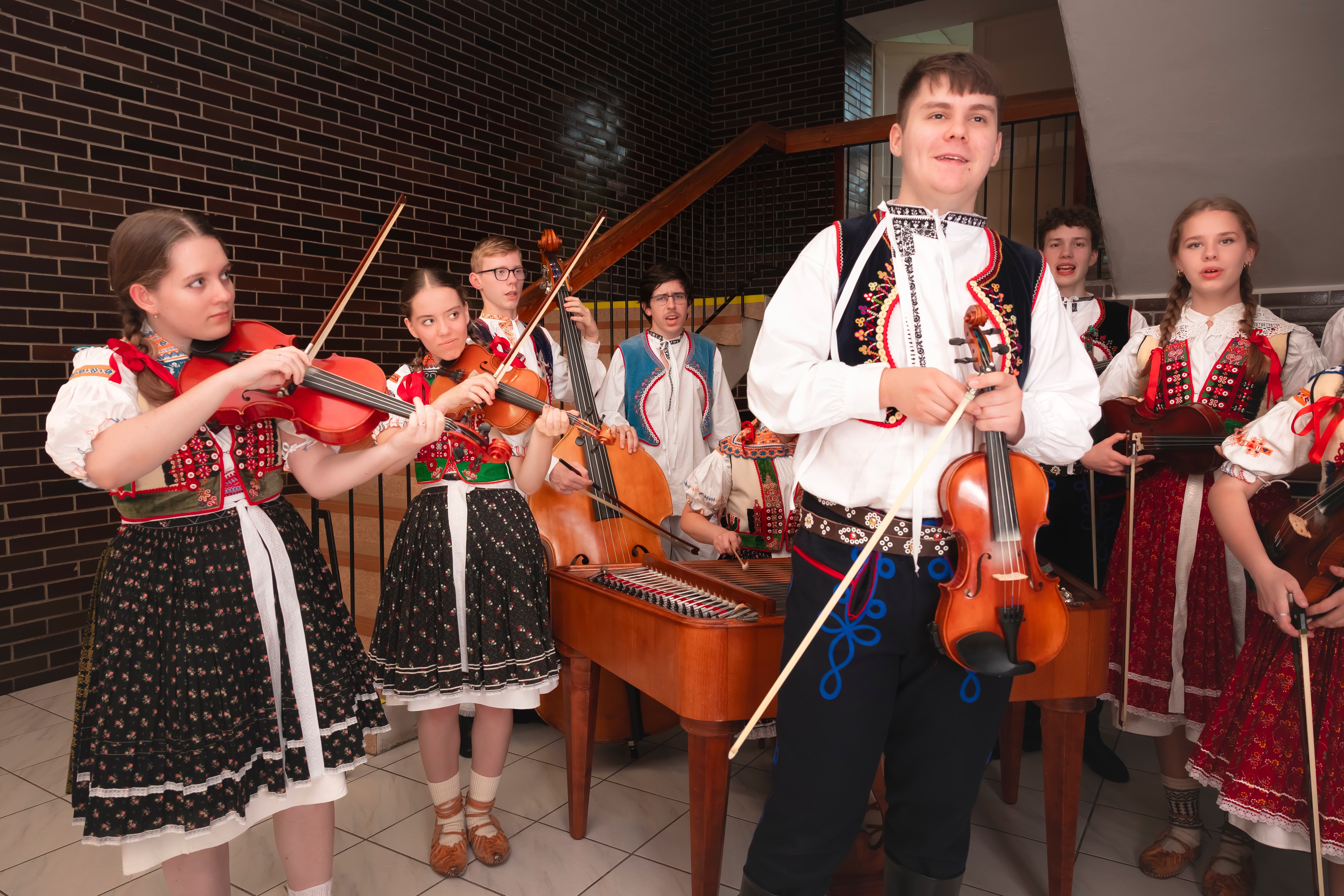 Primášem je Michal Heš, obligát hraje Kačka Ocetková, máme tři druhé housle Jendu Marušáka, Beátu Večerkovou a Lucii Kollárovou, klarinet a flétna je v rukou Františka Konvalinky (je našim nejmladším hráčem) a Zdeňka Marušáka, cimbál krotí Verunka Křižanová, violový kontr hrají sestry Alžbětka a Stázka Vorlovy a nakonec dva basisti Adam Šebesta a Martin Kadlec.
