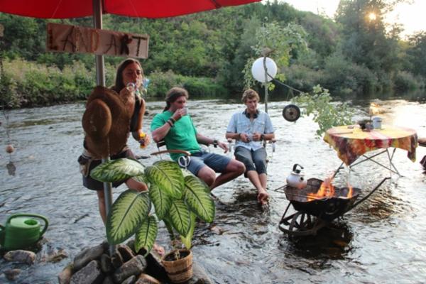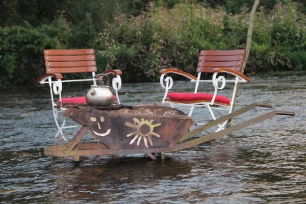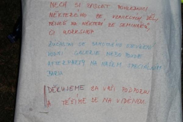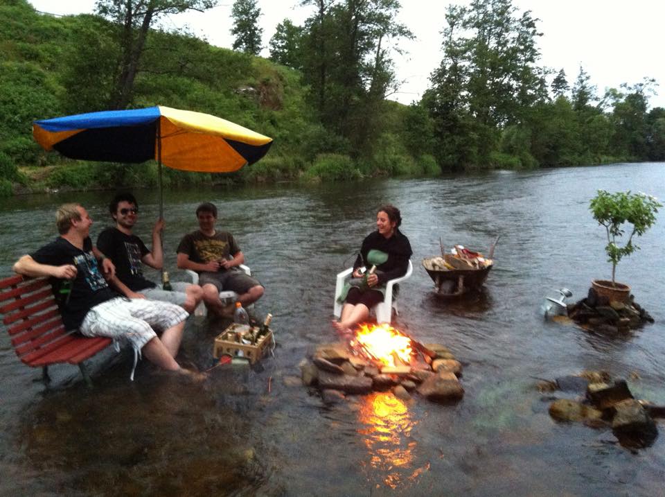 Bude tomu už nějaký čas, co mi Maki vyprávěla o povedené akci konané přímo v naší řece Otavě. Není nad odpolední posezení u piva a ohně a co teprve je-li to v korytě řeky! Při té příležitosti se partička kamarádů rozhodla potěšit oko vodáků a kolemjdoucích nejen touto netradiční podívanou, ale i galerií vytvořenou na kartony z (jak to říci) neslušných obrázků nalezených v chatě jednoho z účastníků. Tento neočekávaný výjev vzbudil značnou pozornost – někoho rozesmál, jiného vyděsil – ale o tom přeci umění je, ne?