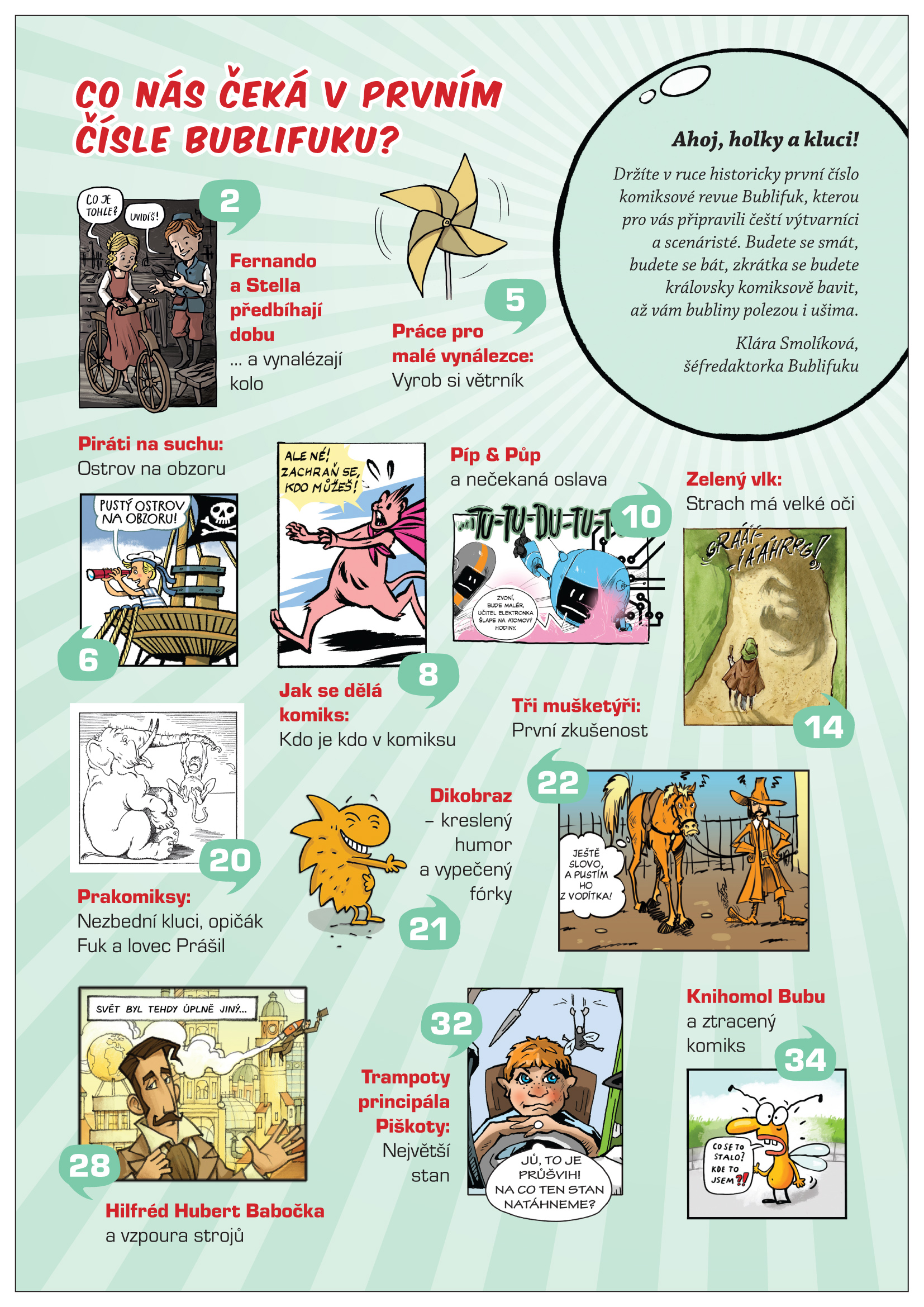 Komiksová revue Bublifuk nabízí holkám a klukům od 7 do 12 let deset původních českých komiksů od předních českých komiksových tvůrců: