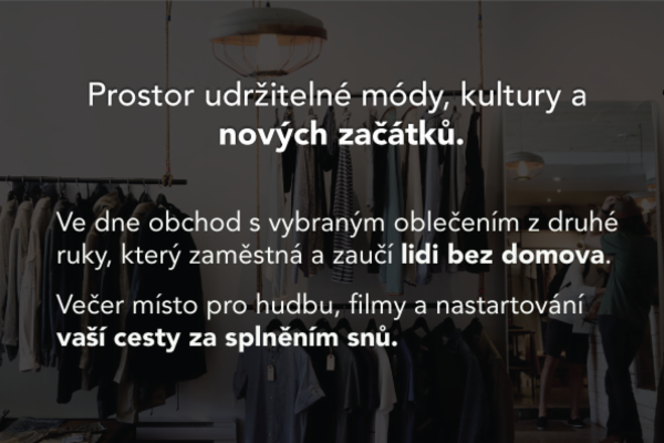 A co si u nás můžete koupit? Hezké čisté oblečení, nábytek i knihy. Darované věci, které stejně jako lidé dostanou druhou šanci. Nechceme být další nepřehledný „sekáč“, ale místo, které by ve dne žilo módou a k večeru bylo domovem pro kulturu či setkání s přáteli. Místo, kam by našli cestu i ti, kteří zrovna nepotřebují nové tričko nebo židli.