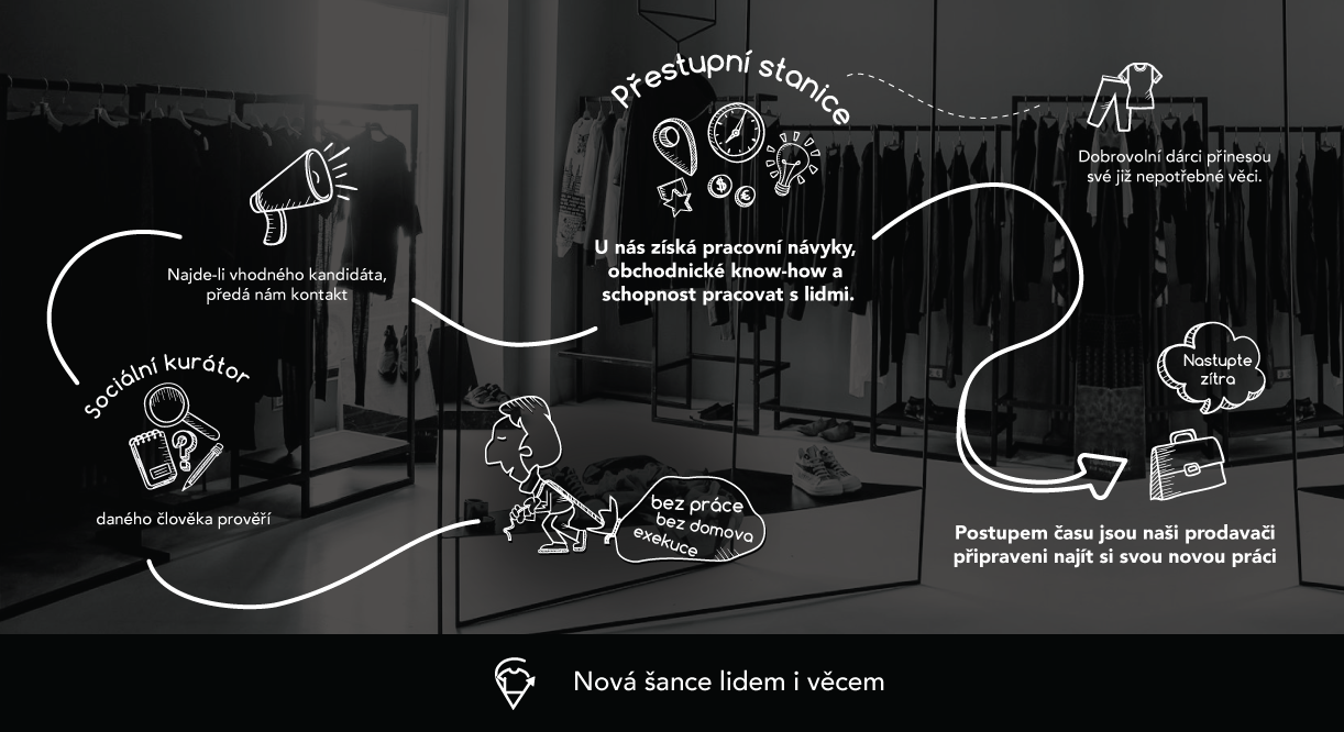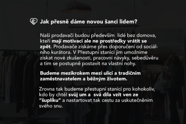 Chceme být Přestupní stanicí mezi ulicí a zaměstnáním. Společně s Vámi můžeme zaměstnat lidi bez domova v místě, které bude komunitním prostorem pro všechny. Otevíráme obchod s věcmi s příběhem, kde lidé i věci dostanou druhou šanci