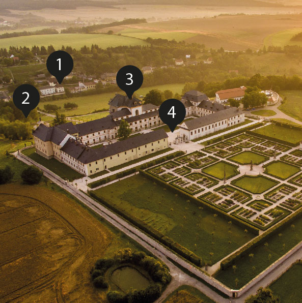 Kde budou slavnosti probíhat: (1) bývalé barokní lázně, (2) ležení císařské armády pod hospitálem, (3) živé obrazy v Hospitálu Kuks, (4) nádvoří a špitální zahrady